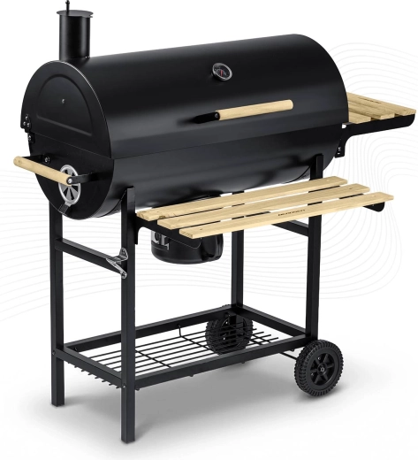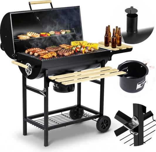 Užijte si grilování bez kompromisů s tímto prostorným zahradním grilem BERDSEN v barelovém stylu. Nabízí velkou grilovací plochu, komín s regulací a integrovaný teploměr pro přesnou kontrolu teploty. Díky skládacím bočním policím, popelníku, kolům pro snadné přesunutí a dřevěným, chladným madlům je obsluha pohodlná a bezpečná.