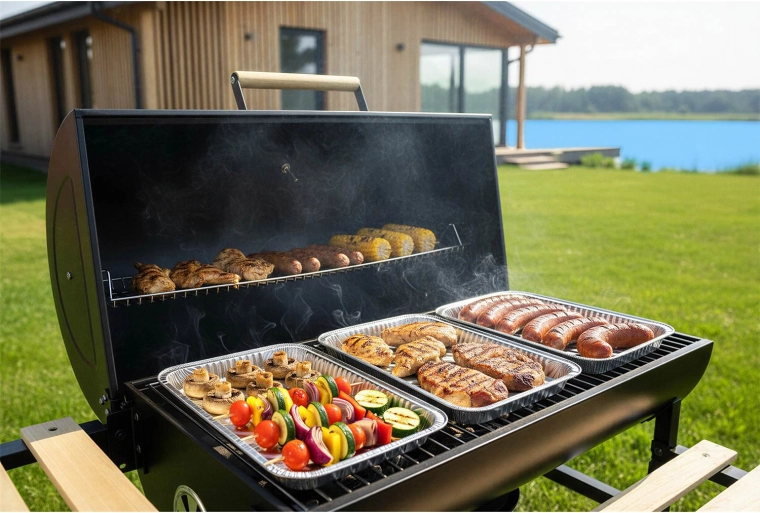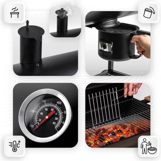 Integrovaný analogový teploměr a komín s regulovatelnou klapkou zajišťují stabilní proudění vzduchu a dohled nad teplotou pro šťavnaté maso a křupavou zeleninu.
