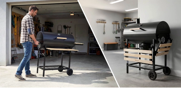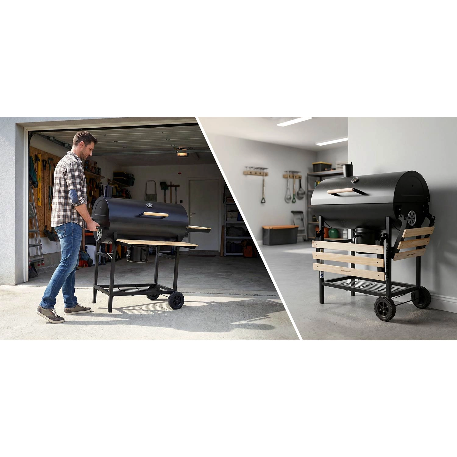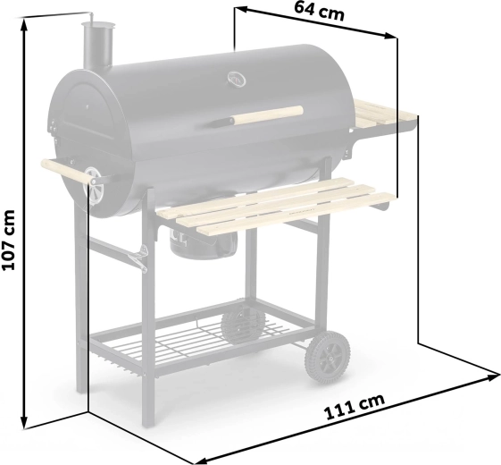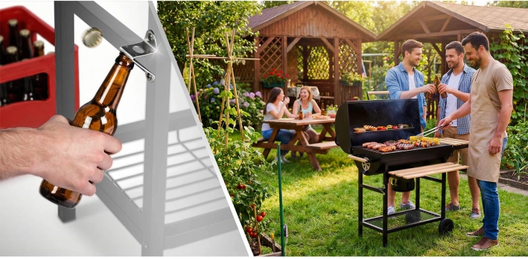 Praktická výbava zahrnuje skládací police na přípravu a odkládání, velkou spodní polici na uhlí a náčiní, pojezdová kola pro snadné přemístění a objemný popelník pro rychlý úklid. Vestavěný otvírák na lahve potěší při každém posezení.