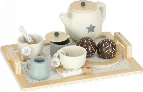 Elegantní dřevěný čajový set v neutrálních barvách s hvězdičkovými detaily je ideální pro dětské čajové dýchánky. Děti mohou servírovat čaj, mléko i „dezert“, trénovat zdvořilost a komunikaci a zároveň rozvíjet fantazii.