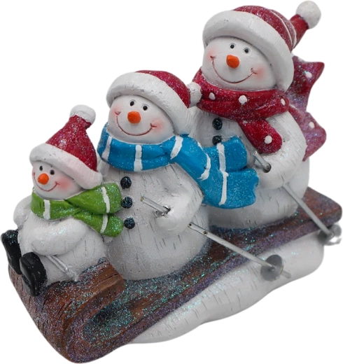 Okouzlující dekorace rodinka sněhuláků na saních vnese do interiéru teplo domova a kouzlo zimní romantiky. S jemnými detaily, barevnými šálami a milým výrazem se stane středem pozornosti na poličce, komodě i parapetu. Díky kvalitním, na dotek příjemným materiálům vydrží zdobit mnoho sezón.