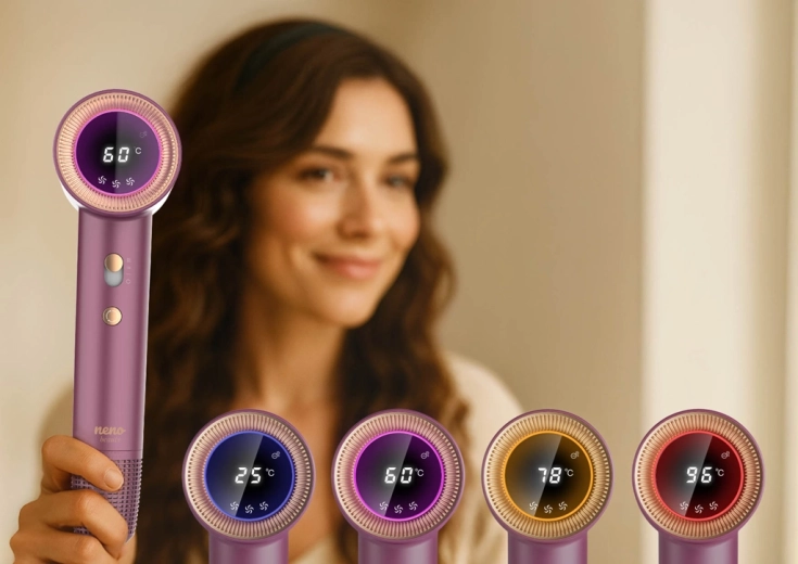Neno Beauty Silvia kombinuje moderní technologii a každodenní komfort. Díky pokročilé ionizaci eliminuje statickou elektřinu, uzavírá kutikuly a zanechává vlasy hladké a lesklé. Inteligentní senzor hlídá teplotu až 100× za sekundu, čímž chrání vlasy před přehřátím a poškozením. LED displej s barevným kroužkem přehledně ukazuje teplotu i rychlost proudění, takže máte styling pod kontrolou jediným pohledem.
