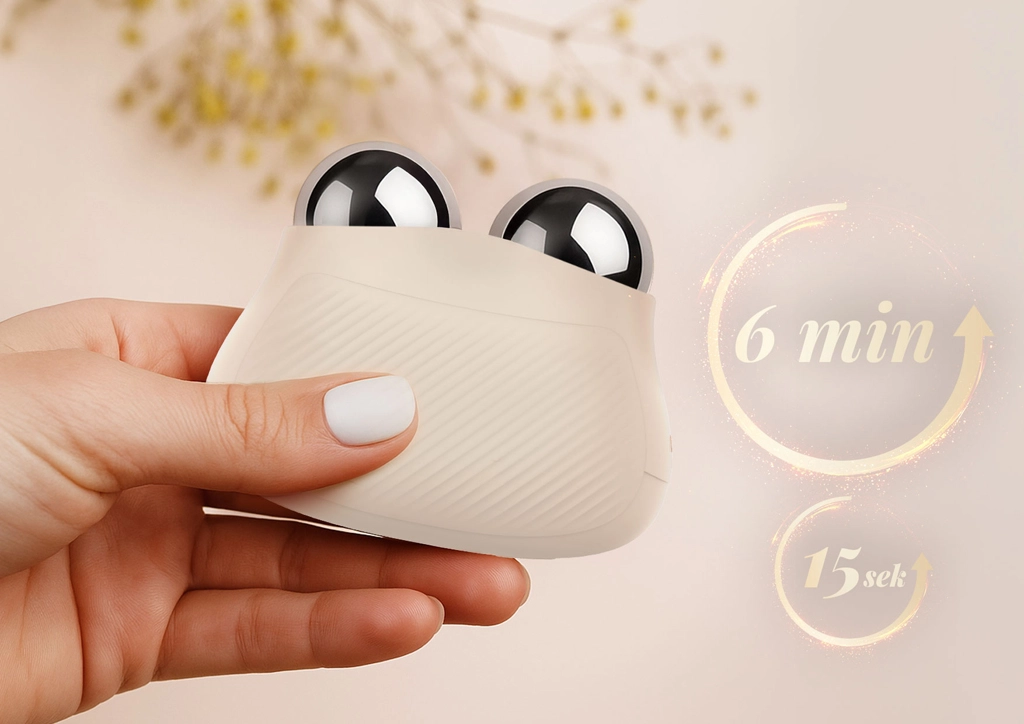 Ergonomická dvojitá hlavice přirozeně kopíruje tváře, čelist i krk. Pět úrovní intenzity, paměť posledního nastavení a 6minutový časovač s intervaly po 15 s zjednoduší každodenní rituál.