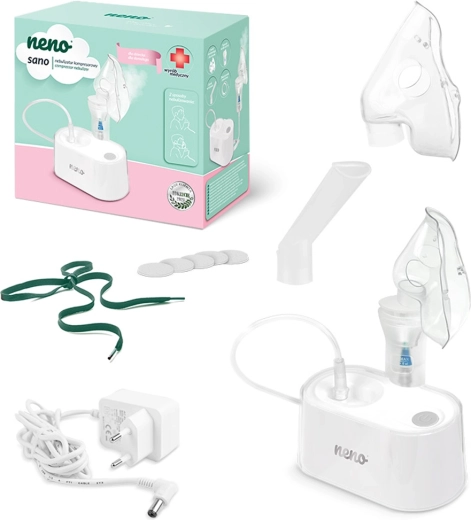 - Inhalátor Neno Sano, dětská maska, maska pro dospělé, náustek, léková nádobka, vzduchová hadička 150 cm, 2× náhradní vzduchový filtr, napájecí adaptér, návod k použití