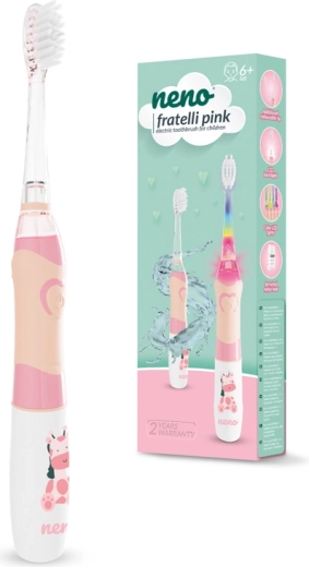 Zpříjemněte dětem každodenní čištění zubů s elektrickým kartáčkem Neno Fratelli. Nabízí jemné nylonové štětinky, až 24 000 vibrací za minutu, barevné LED světlo a 2minutový časovač s 30s intervaly pro správnou techniku. Díky voděodolnosti IPX7 a ergonomickému provedení je to ideální volba pro děti od 6 let.