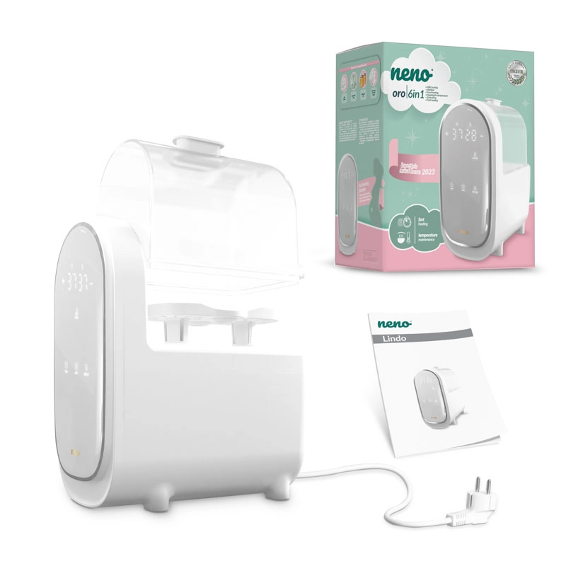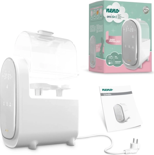 Kompaktní a elegantní Neno Lindo 6v1 je multifunkční zařízení pro péči o dětskou výživu a hygienu. Nabízí sterilizaci lahví, dudlíků a kousátek, přesné ohřívání mléka a pokrmů, rozmrazování a udržování teploty. Díky dotykovému panelu, LED podsvícení a chytrým režimům je obsluha rychlá, tichá a bezpečná i v noci. Štíhlé rozměry šetří místo na lince a vejde se i do zásuvky.