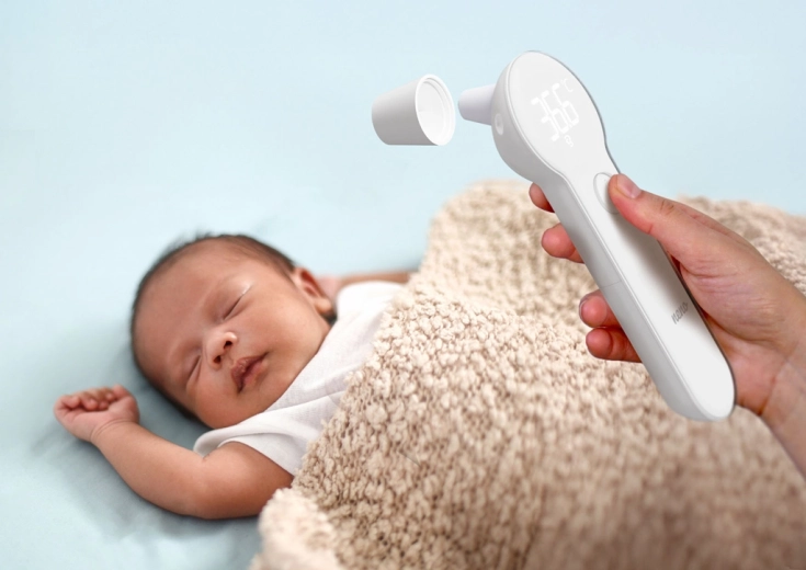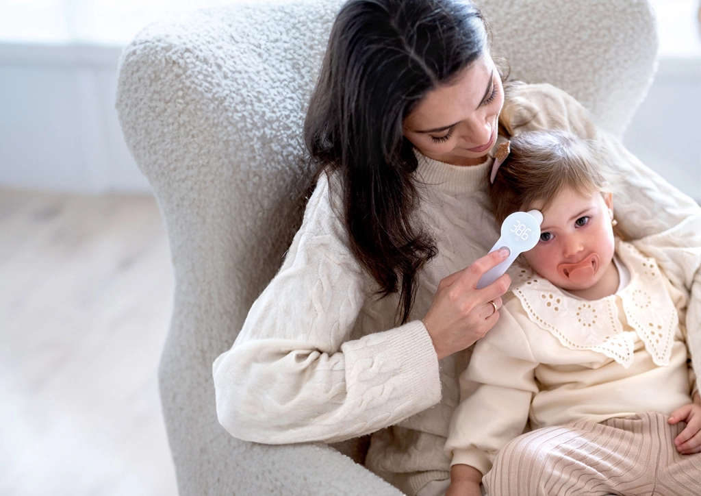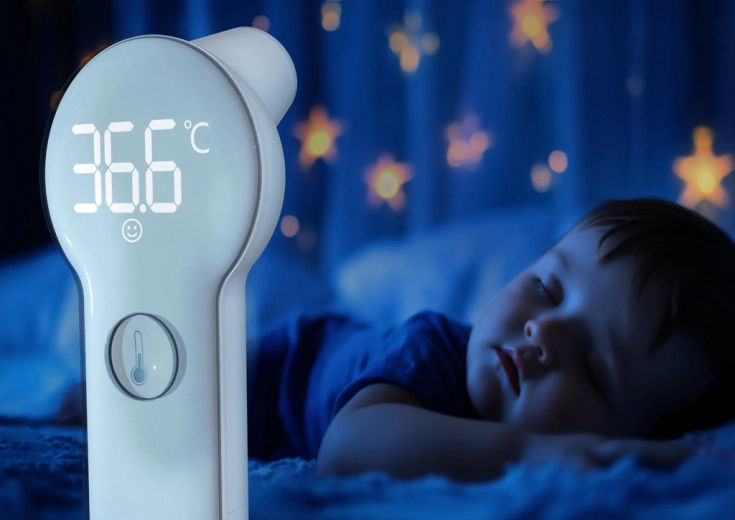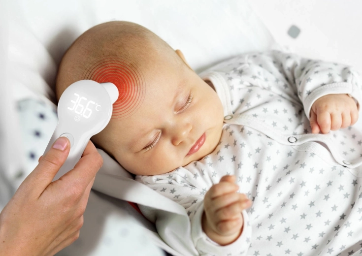 Velké, jasné číslice snadno přečtete i ve tmě. Šetrné bezdotykové měření neprobudí spící dítě.