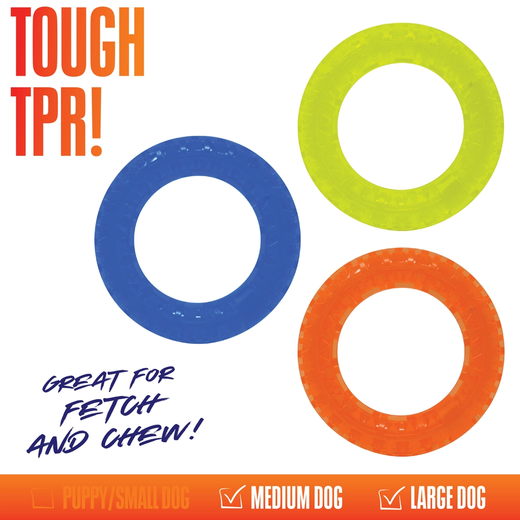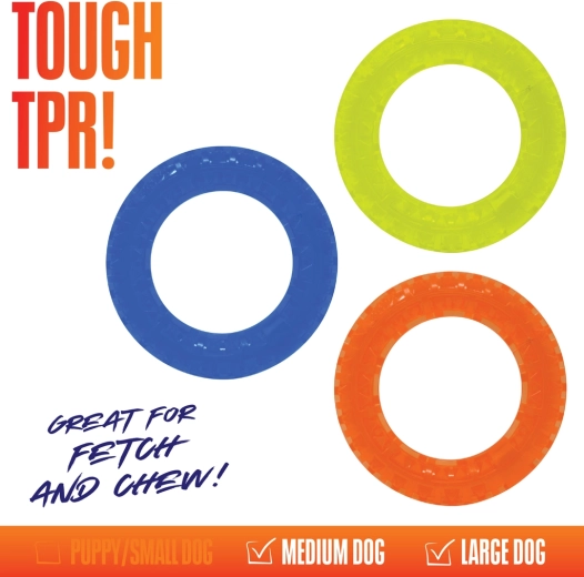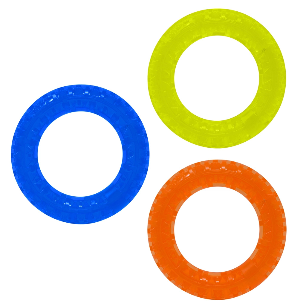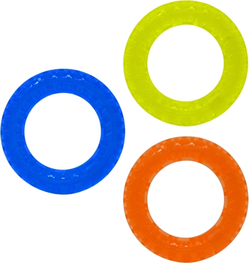 Lehká a odolná sada tří kroužků z TPR pro aktivní hru psů. Kruhy o průměru 12,5 cm mají texturovaný povrch se spiky pro lepší úchop a stimulaci dásní. Díky kontrastním barvám jsou dobře viditelné při aportování venku i doma a skvěle se hodí pro menší až střední plemena.