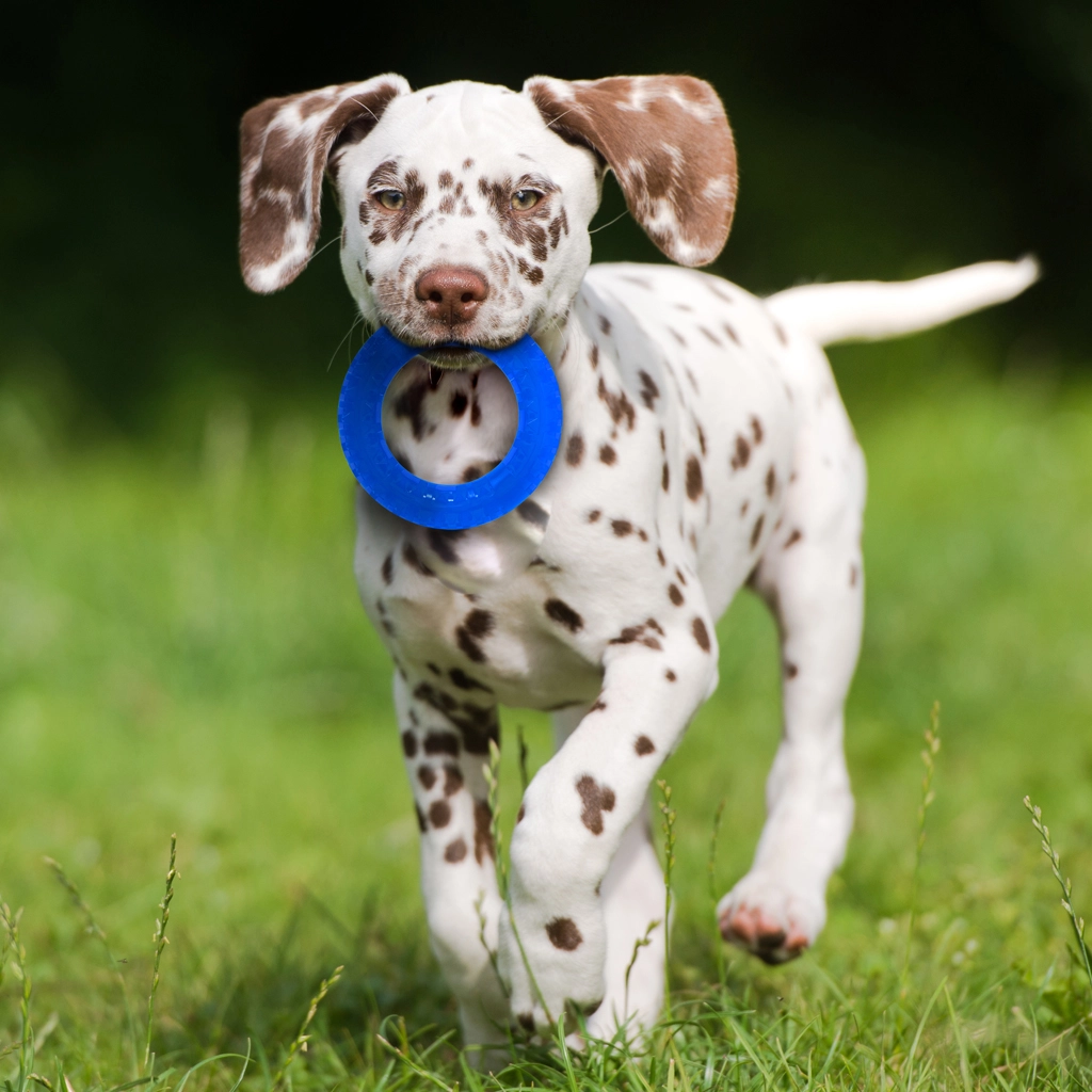 Průhledná termoplastická pryž (TPR) zajišťuje pružnost, odolnost při opakovaném házení a pohodlné nošení v tlamě. Ideální pro každodenní trénink aportu.