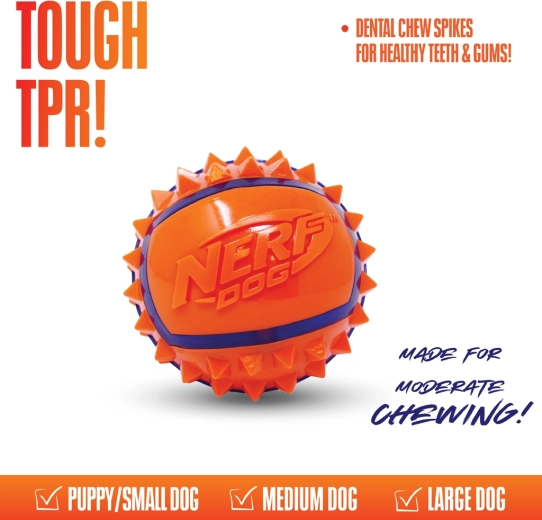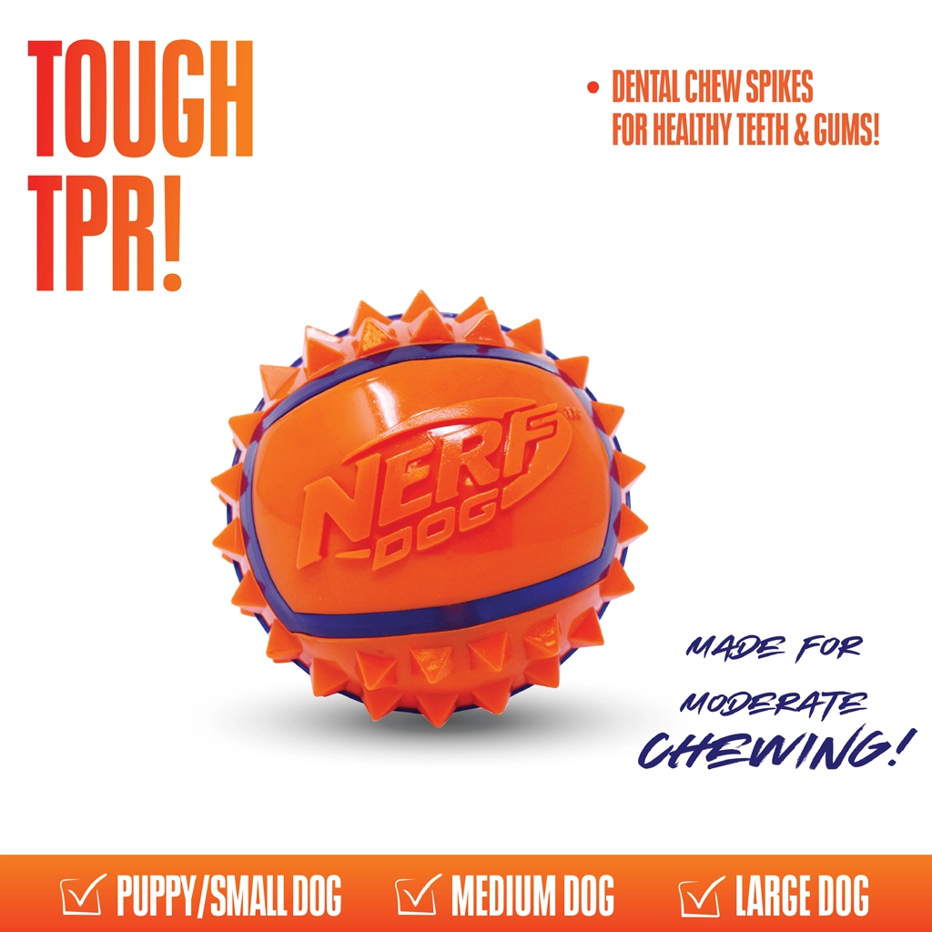 Nerf Dog spiky míček pro psy 9 cm přináší psům radost z pohybu a majitelům pohodlné házení i nošení. Kvalitní termoplastická pryž (TPR) spojuje pevnost, pružnost a odolnost, takže se hodí pro pravidelné používání. Díky kontrastním barvám je míček snadno viditelný i při rychlé hře v exteriéru.