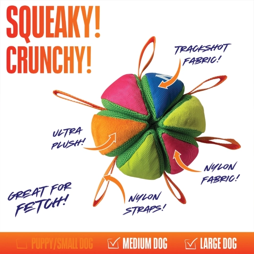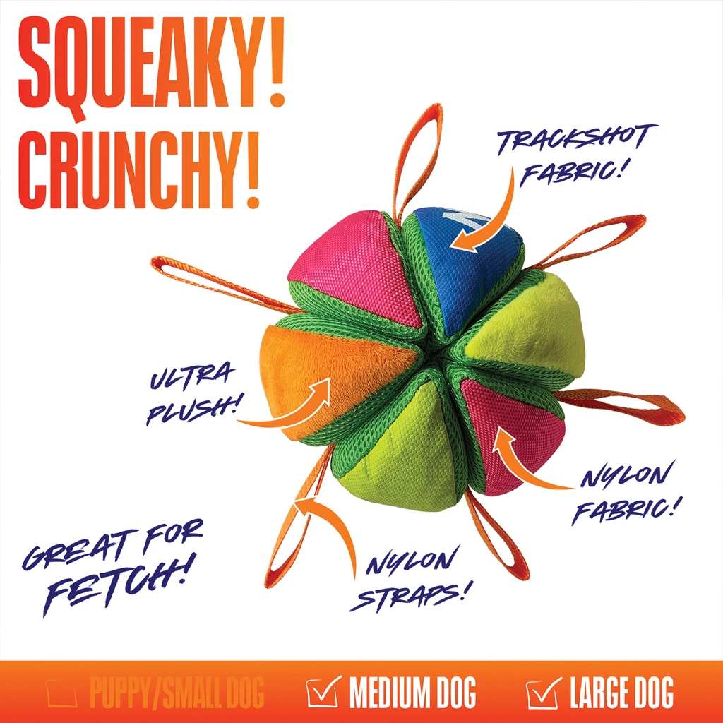 Díky více nylonovým páskům se míček snadno chytá, nosí a přetahuje. Speciální kapsy na pamlsky přidávají odměnu do hry a prodlužují zábavu. Zesílená tkanina Trackshot a pevné švy zajišťují výjimečnou odolnost i při intenzivním používání.