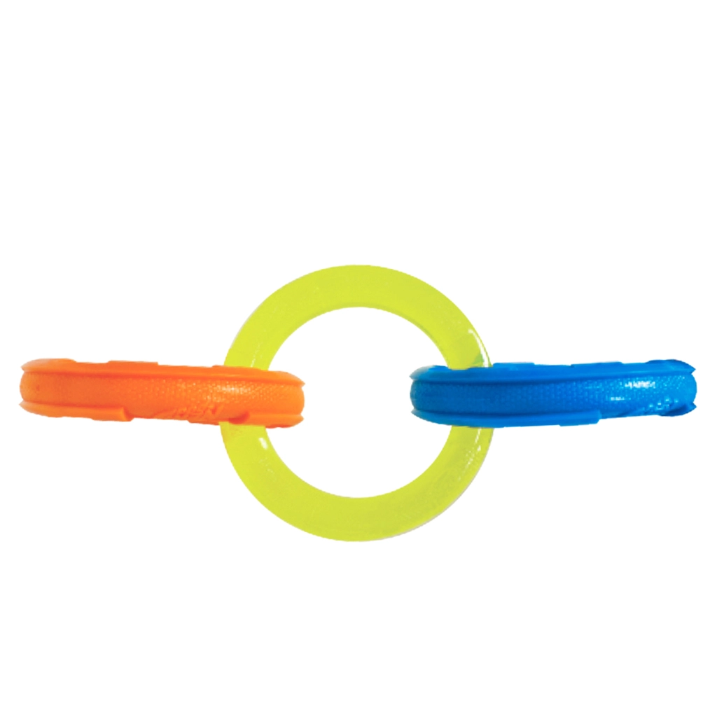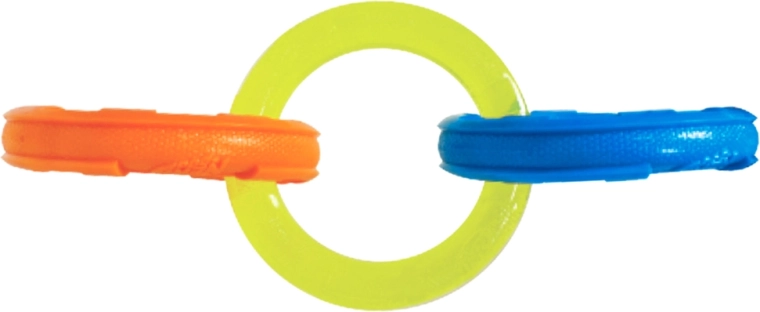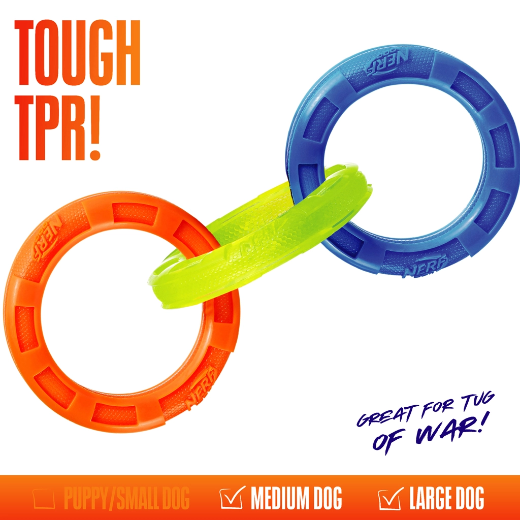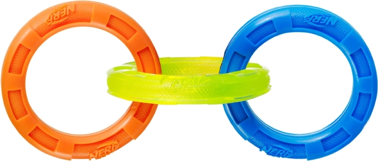 Odolná interaktivní hračka pro psy se třemi propojenými kroužky pro přetahování a aport. Díky délce 26,7 cm je ideální pro střední a velká plemena. Voděodolné provedení, vroubkovaná textura pro zdravé zuby a dásně a lehké, ale mimořádně odolné materiály Nerf Tough zaručují dlouhou zábavu a bezpečnost při hře venku i doma.