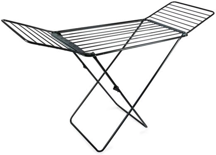 Snadno se rozkládá i skládá, má bezpečnostní pojistku a ve spodní části ochranné prvky proti poškrábání podlahy. Praktické boční klipy na drobné kusy prádla ušetří kolíčky i místo. Minimalistické černé provedení se hodí do moderních interiérů i na balkon či zahradu.