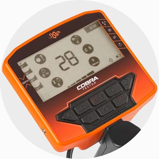 COBRA TECTOR Rush je pokročilý detektor kovů navržený pro pohodlné a přesné hledání v terénu. Velký LCD displej zobrazuje ID cíle, ikony typu kovu, hloubku uložení, zvolený režim, úroveň citlivosti, hlasitosti i stav baterie. Vodotěsná DD cívka o průměru 28 cm (IPX7) umožní hledání i na mokrém povrchu a v mělké vodě.