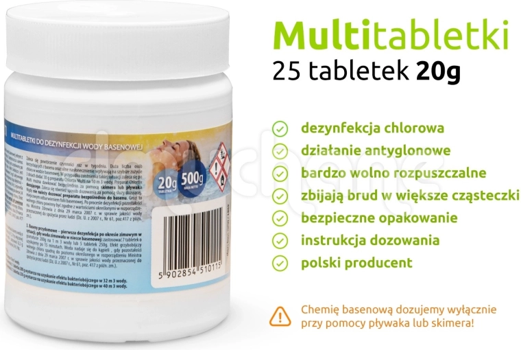 Udržujte vodu v bazénu křišťálově čistou a hygienicky bezpečnou díky multifunkčním chlorovým tabletám 20 g. Tablety se pomalu rozpouštějí, zajišťují trvalou dezinfekci, zamezují tvorbě řas a podporují flokulaci pro snadnější zachycení nečistot filtrem.