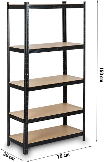 Pět pevných MDF polic (5 mm) a zesílené ocelové profily (0,7 mm) poskytují nosnost až 150 kg na polici, celkem až 750 kg při rovnoměrném zatížení.