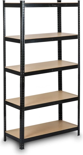 Hledáte univerzální a pevné řešení do garáže, dílny či skladu? Tento černý kovový regál se zesílenou konstrukcí nabízí špičkovou stabilitu, vysoké zatížení a flexibilní uspořádání. Pět odolných polic z MDF (tloušťka 5 mm) unesou při rovnoměrném rozložení až 265 kg každá, takže bez potíží uložíte nářadí, boxy, zásoby i přístroje.