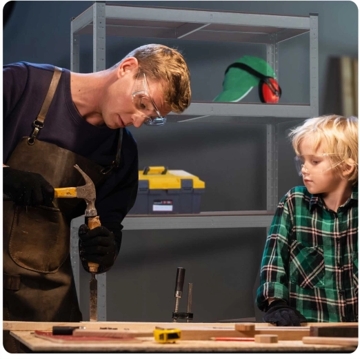 Díky chytrému bezšroubovému systému je montáž rychlá a čistá – police snadno umístíte do požadované výšky s krokem 40 mm. Regál můžete rozdělit na dva menší kusy pro ještě flexibilnější uspořádání nebo z něj vytvořit praktický pracovní stůl do dílny.