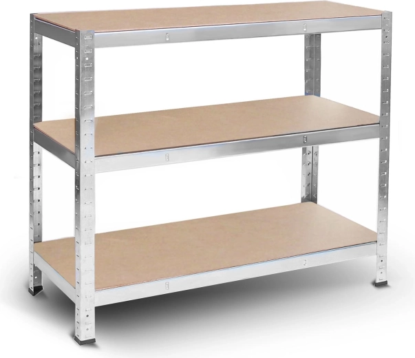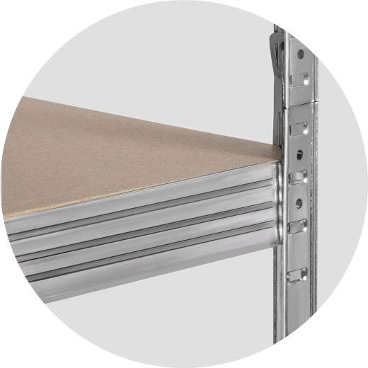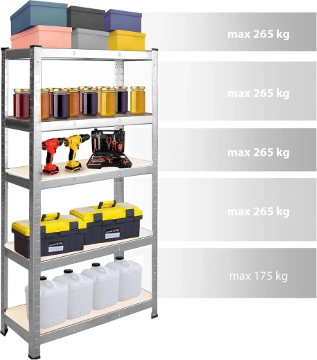 Tento robustní skladový regál ve stříbrném zinku kombinuje vysokou nosnost s maximální variabilitou. Pět pevných polic z MDF lze výškově upravovat v krocích po 40 mm, takže snadno přizpůsobíte úložný prostor nářadí, krabicím i těžším zařízením. Dva zesílené středové výztuhy na každé polici zajišťují stabilitu i při vysokém zatížení.