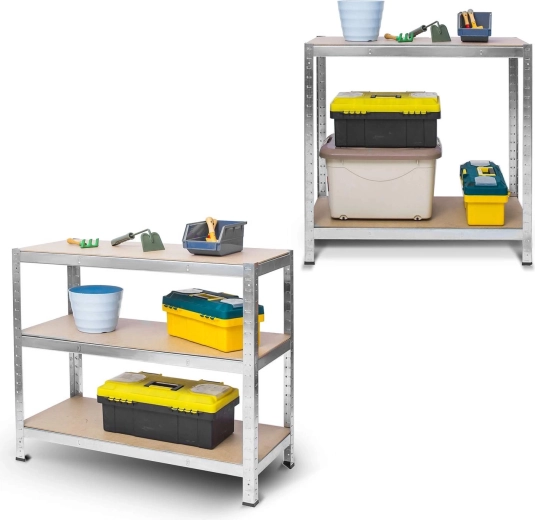Díky chytré konstrukci jej můžete rozložit na dva samostatné regály nebo použít jako pracovní stůl. Bezšroubové spojení na zacvaknutí umožňuje rychlou a snadnou montáž bez nářadí. Ochranné plastové koncovky nohou zvyšují stabilitu a chrání podlahu před poškrábáním, zatímco zaoblené hrany přispívají k bezpečnému používání.