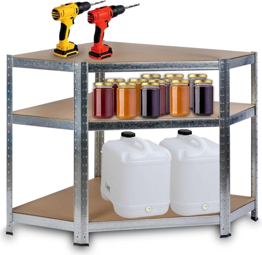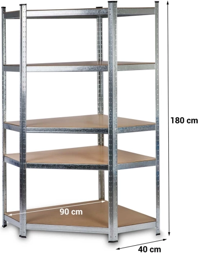 Hledáte odolné a úsporné řešení pro přehledné skladování? Kovový rohový regál Humberg v elegantní stříbrné (ocynkované) úpravě šetří prostor a zároveň poskytuje mimořádně vysokou kapacitu. Pět polic z MDF se středovými výztuhami unese až 875 kg celkem (při rovnoměrném rozložení). Díky plastovým koncovkám nohou je regál stabilní a šetrný k podlaze.
