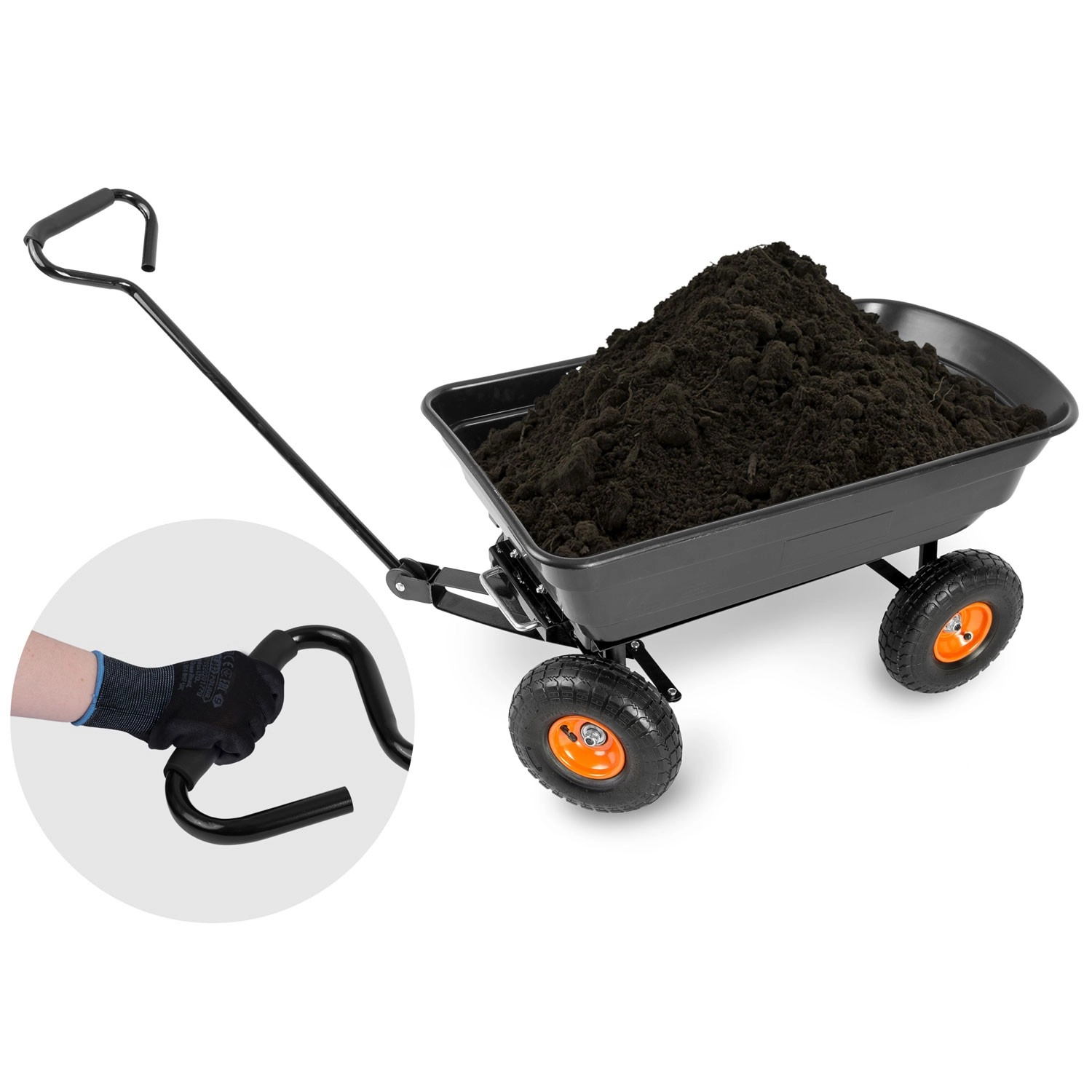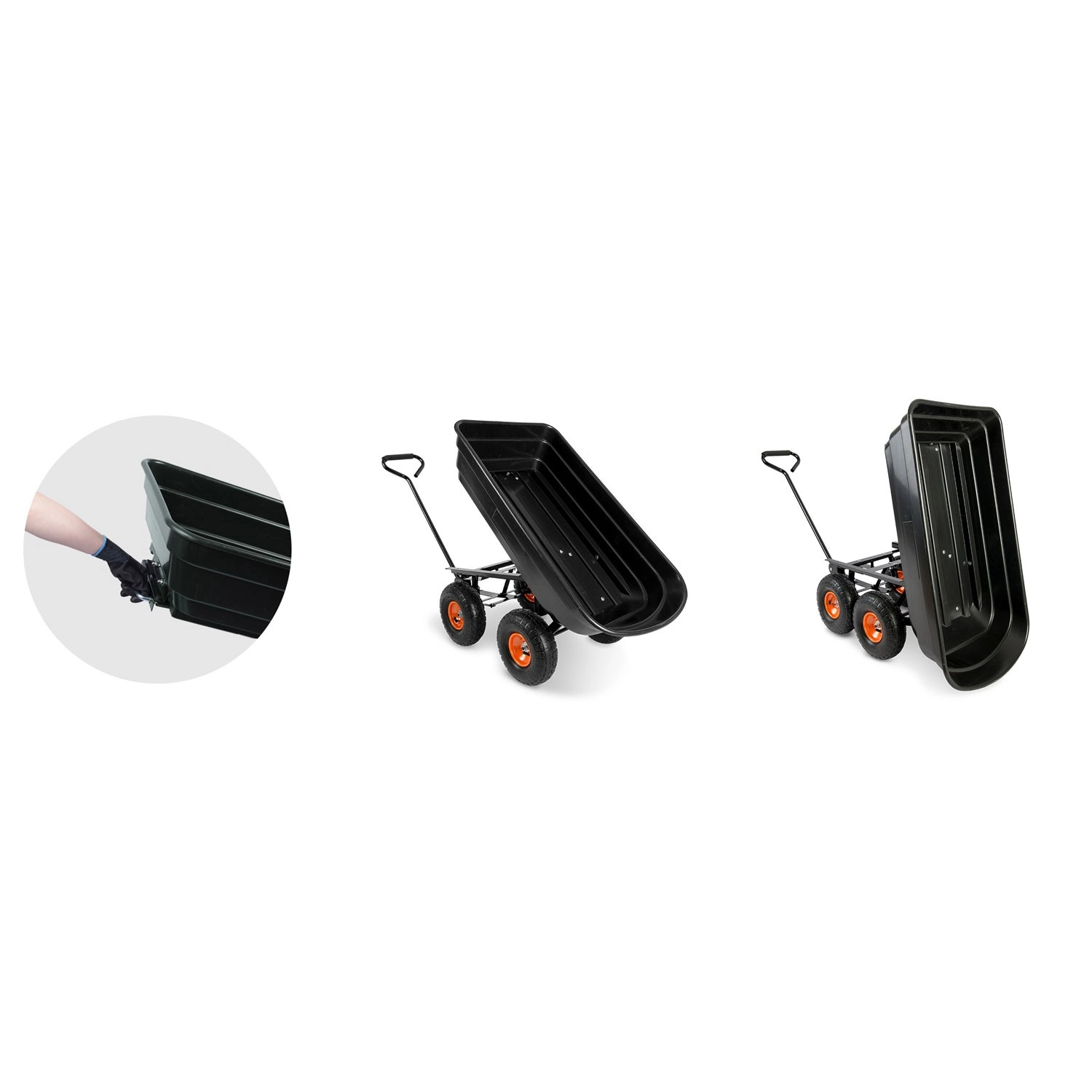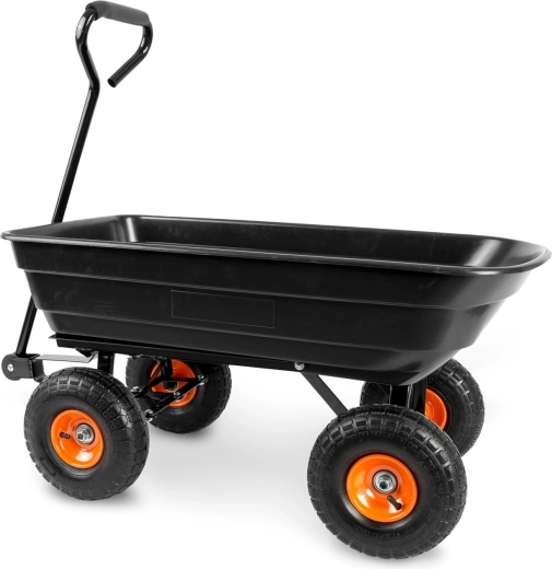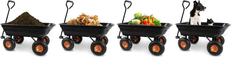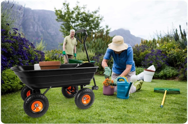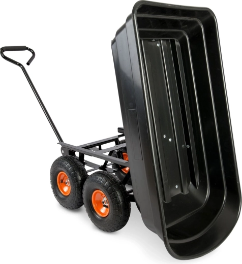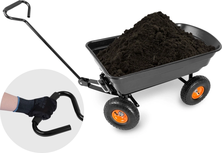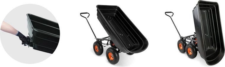 Praktická 3v1 konstrukce spojuje použití jako ruční vozík, zahradní kolečko a vyklápěcí káru. Vyklápěcí mechanismus umožňuje rychlé vysypání zeminy, listí či stavebního materiálu přímo na místo, kde je potřebujete. Řiditelná (otočná) přední náprava zajišťuje přesné zatáčení a lepší kontrolu při jízdě se zátěží.