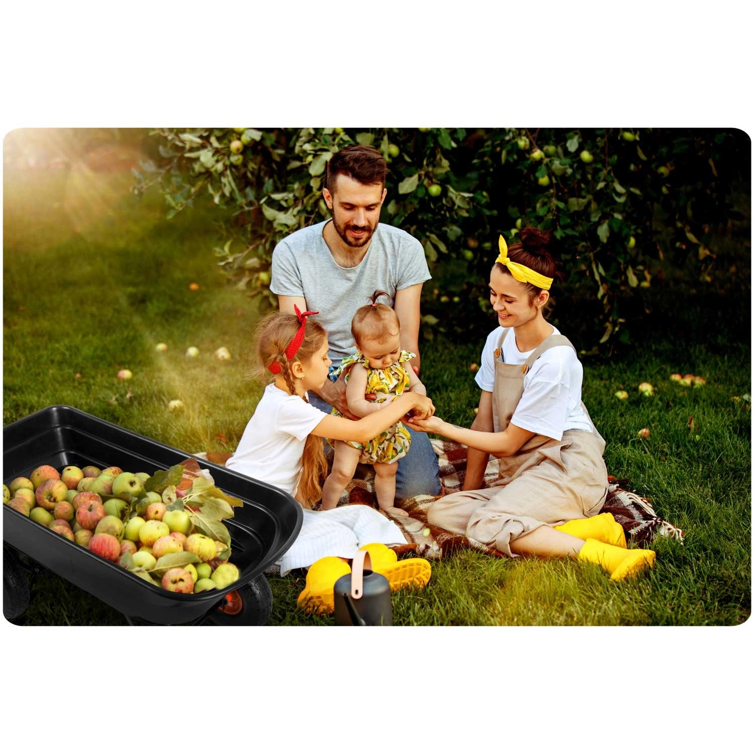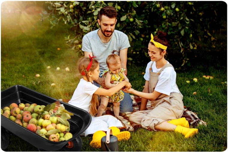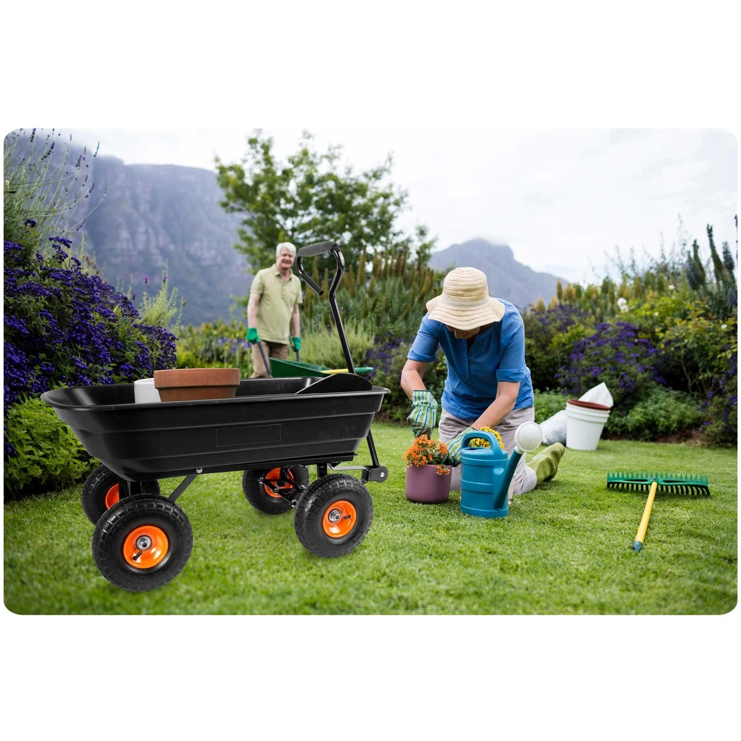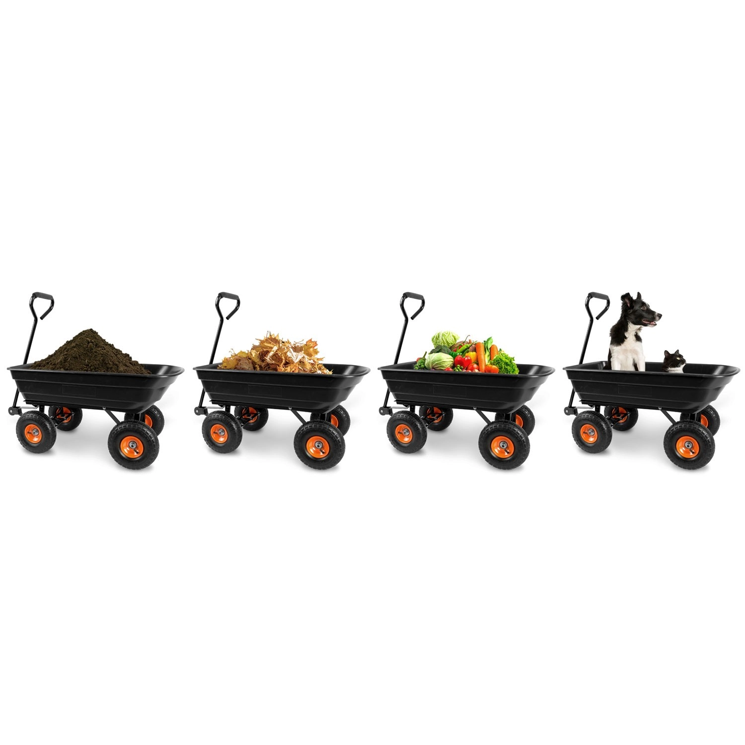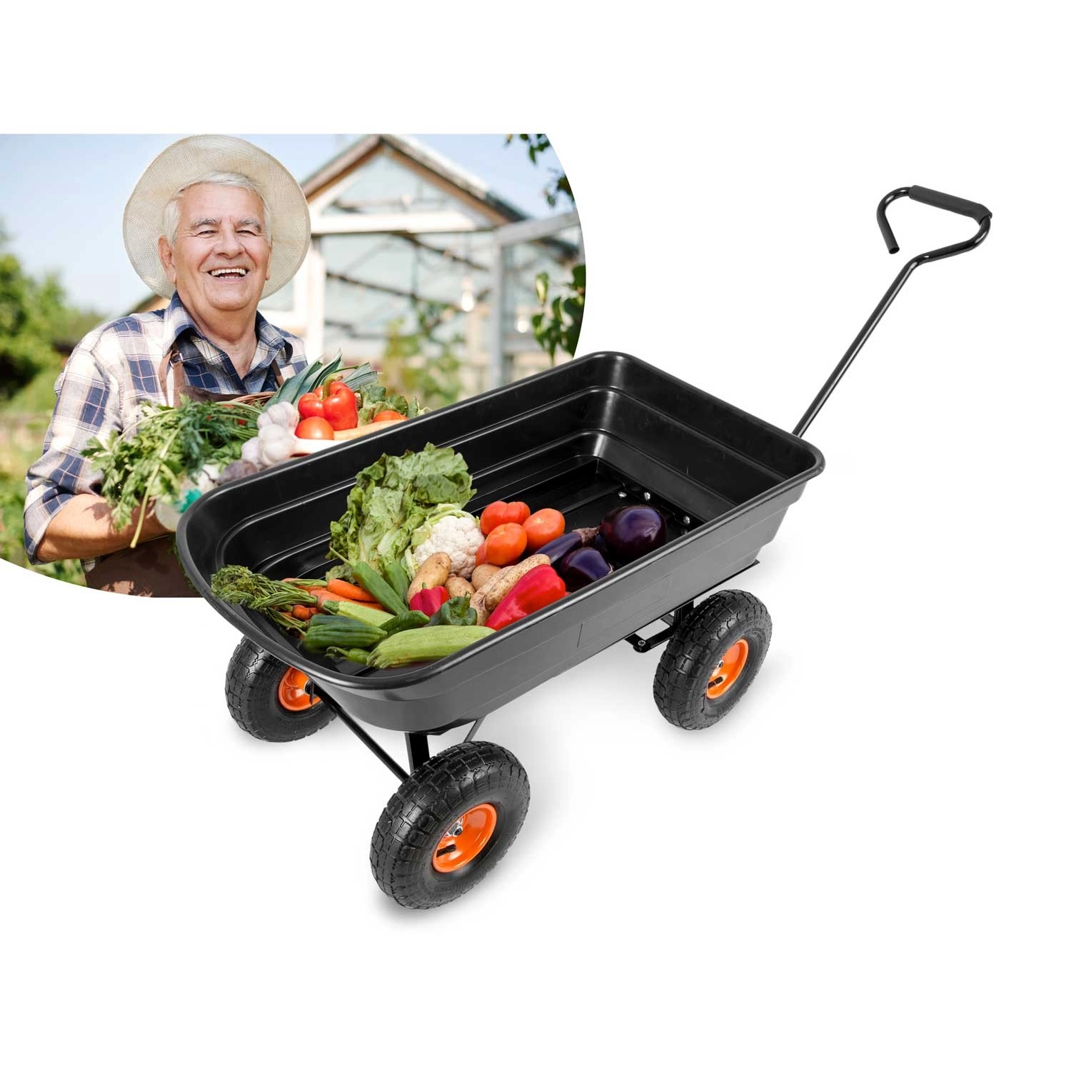 Praktická 3v1 konstrukce spojuje použití jako ruční vozík, zahradní kolečko a vyklápěcí káru. Vyklápěcí mechanismus umožňuje rychlé vysypání zeminy, listí či stavebního materiálu přímo na místo, kde je potřebujete. Řiditelná (otočná) přední náprava zajišťuje přesné zatáčení a lepší kontrolu při jízdě se zátěží.