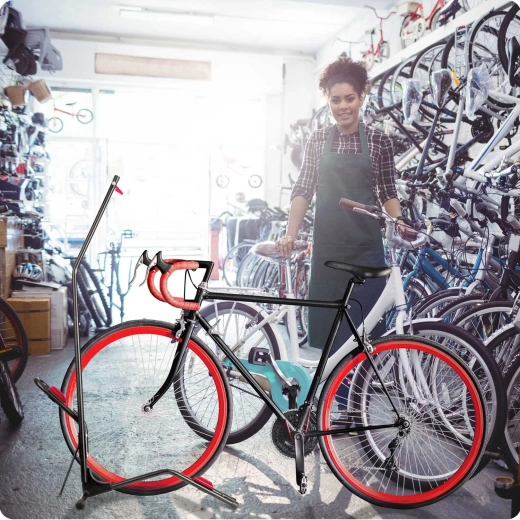 Široká základna, opěrná kolébka a háky s ochranou udrží kolo pevně na místě bez hrozby převrácení při servisu i skladování.