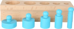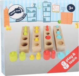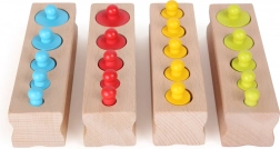 Dřevěné barevné válečky pomáhají dětem porozumět vzorům a činit rozhodnutí o správném umístění.