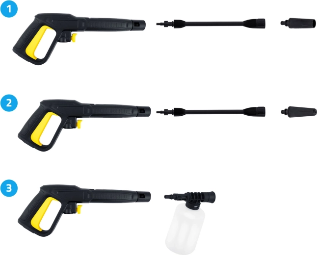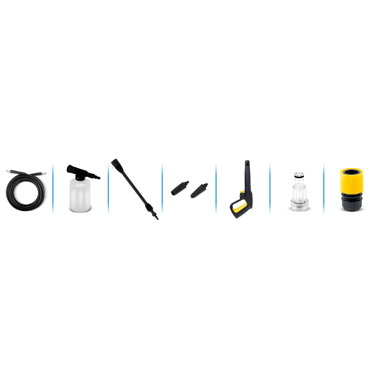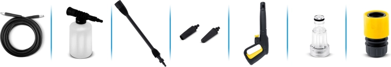 - lance s nastavitelnou tryskou, turbotryska, vysokotlaká hadice 6 m, přípojka vody, rychlospojka, láhev na detergent 450 ml, čistící jehla trysek, napájecí kabel 5 m