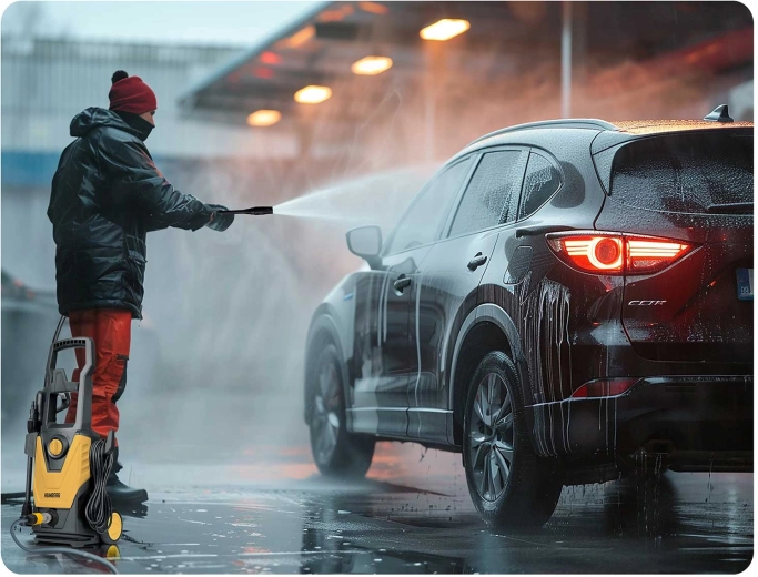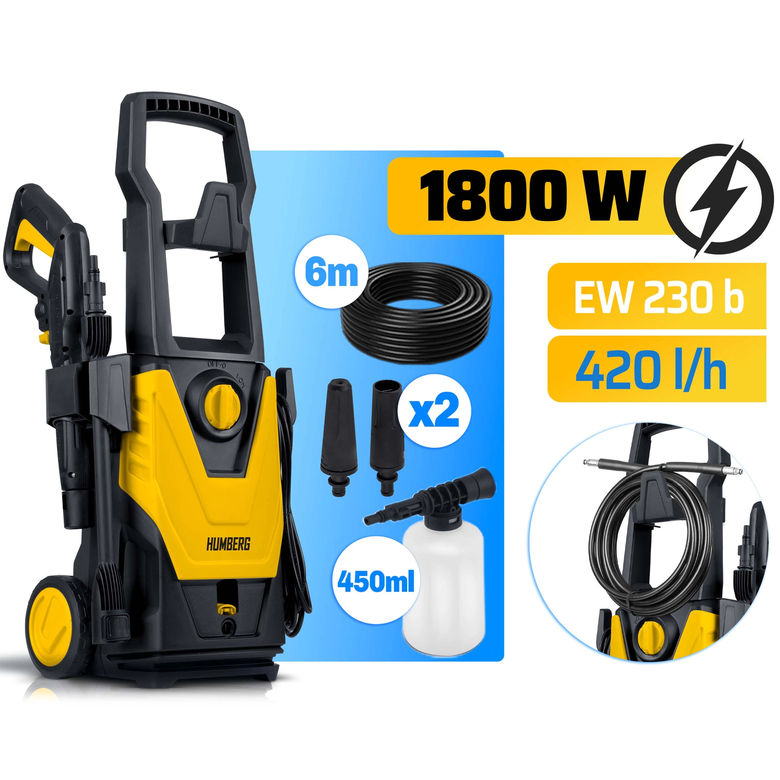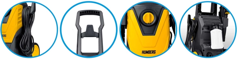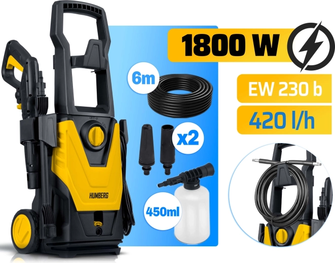 Kompaktní a výkonný vysokotlaký čistič HUMBERG HM-300 s motorem 1800 W, hliníkovým samonasávacím čerpadlem a tlakem až 135 bar zvládne mytí auta, dlažby i terasy. Nabízí regulovatelnou trysku, turbotrysku TurboStream™, pěnovač (450 ml), 6m vysokotlakou hadici a 5m napájecí kabel. Systém StopAndSafe™ šetří vodu i energii a prodlužuje životnost zařízení, možnost přívodu teplé vody do 60 °C zvyšuje účinnost čištění.