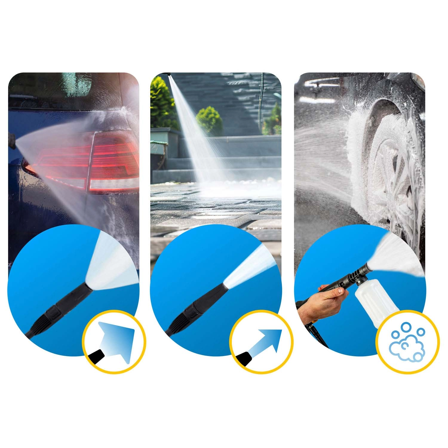 Přepněte na turbotrysku pro koncentrovaný paprsek na nejodolnější nečistoty nebo využijte plynulé nastavení vějířového proudu pro šetrné mytí karoserie a oken.