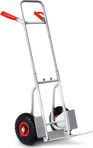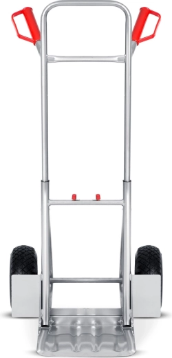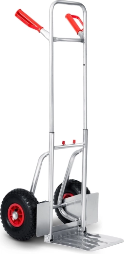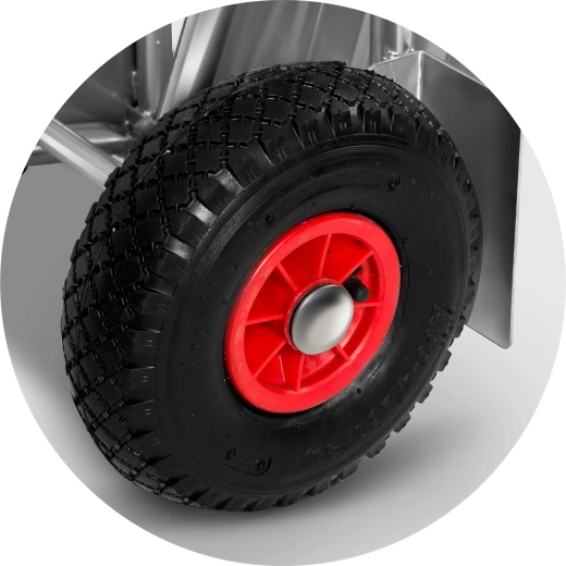 Velká nafukovací kola s ventily a kovovým vyztužením zajišťují hladký převoz nákladu přes prahy, dlažbu i hrubší povrchy.