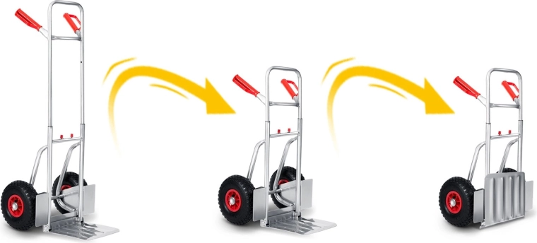 Spodní plošina se rychle sklopí a vozík snadno uložíte do kufru vozu nebo regálu – ideální pro kurýry a stěhování.