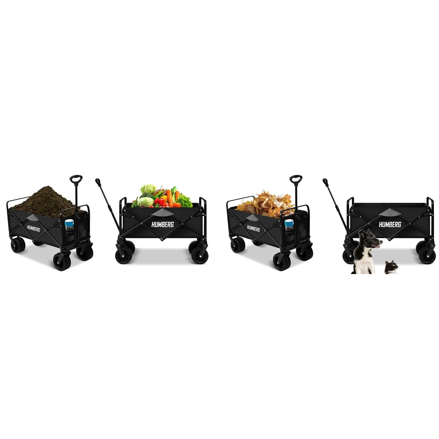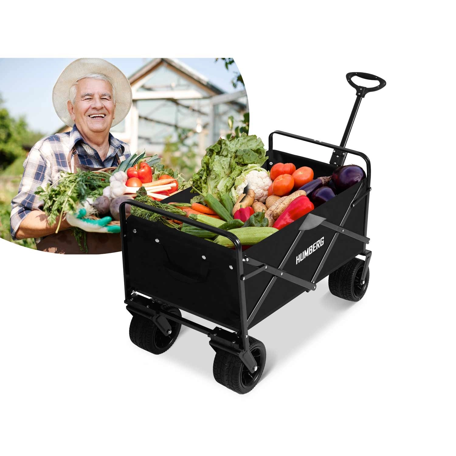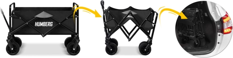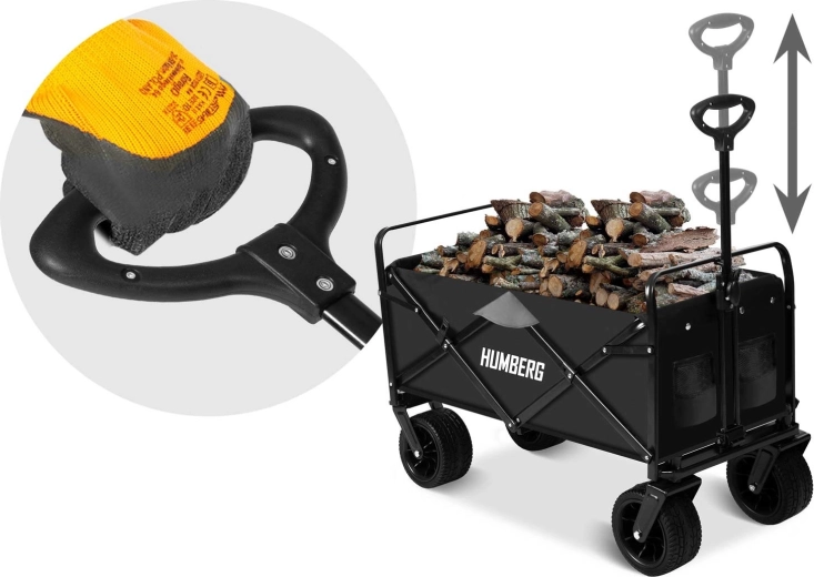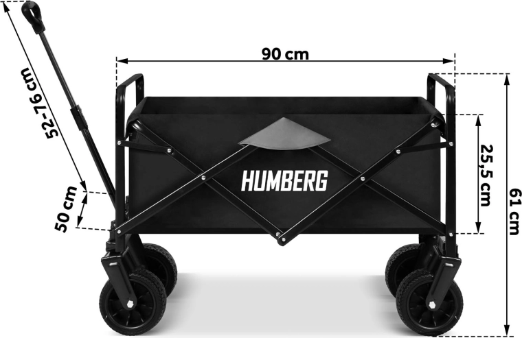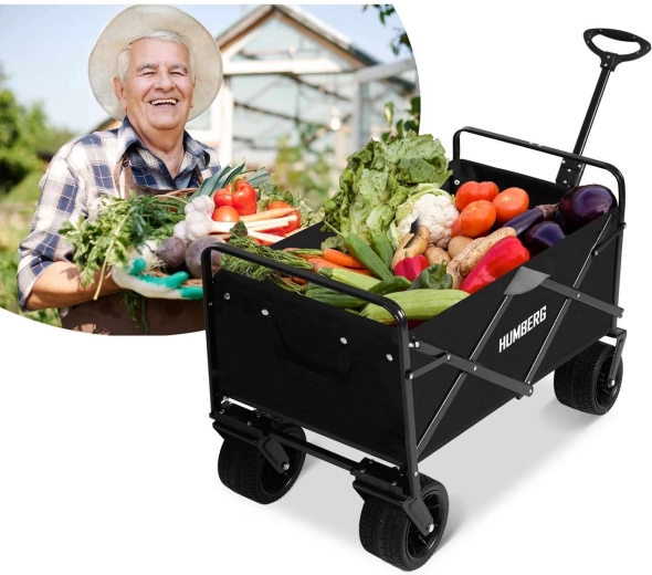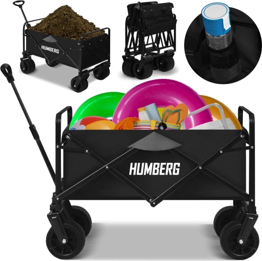 Praktický skládací vozík HUMBERG s objemem 100 l a nosností až 120 kg usnadní přepravu nákladu na zahradě, na pláži i při cestování. Díky otočným kolům 360°, teleskopické rukojeti a stabilní ocelové konstrukci se snadno ovládá i v nerovném terénu. Rychlé složení, odolná textilie a praktické kapsy na nápoje z něj dělají nepostradatelného pomocníka pro každý den.