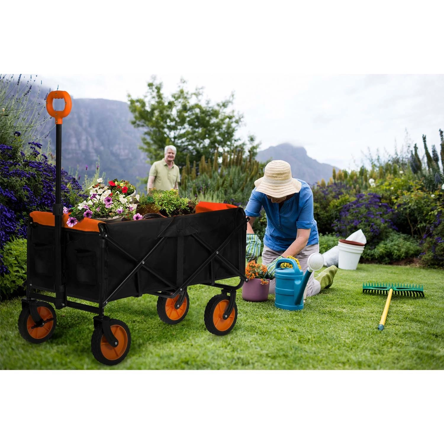 Přední kola se volně natáčejí, takže vozík hladce projede i užšími uličkami a nerovným terénem. Teleskopická rukojeť s ergonomickým úchopem zvyšuje komfort.