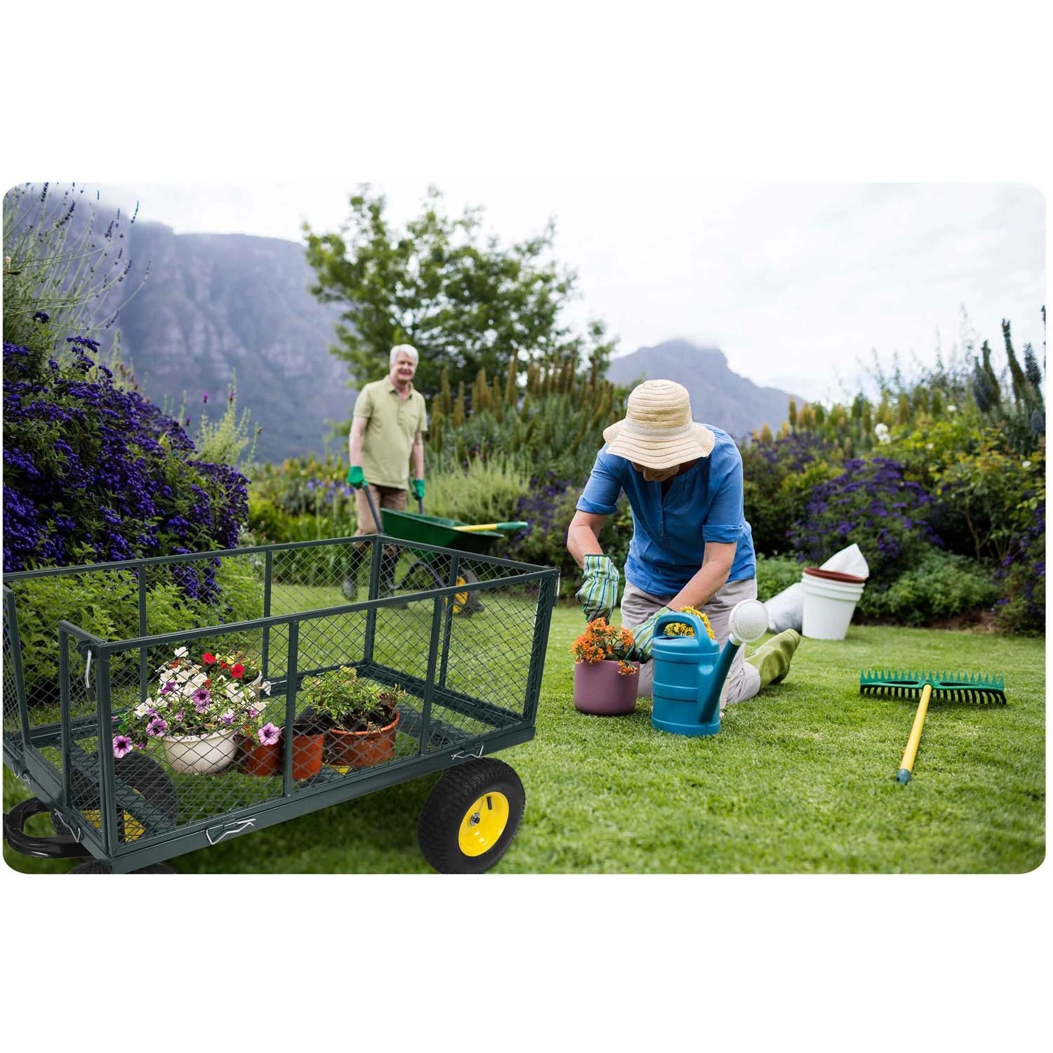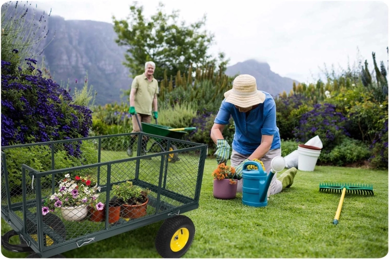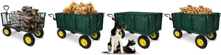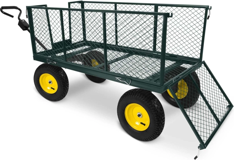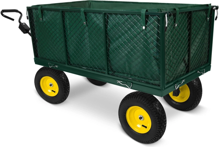 Práškově lakovaná ocel odolává korozi i nárazům, takže vozík spolehlivě zvládne každodenní zátěž na zahradě i dvoře.