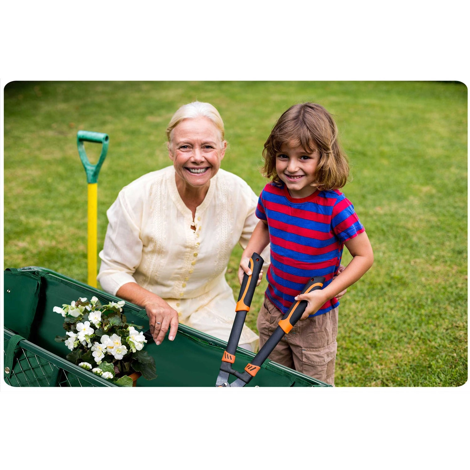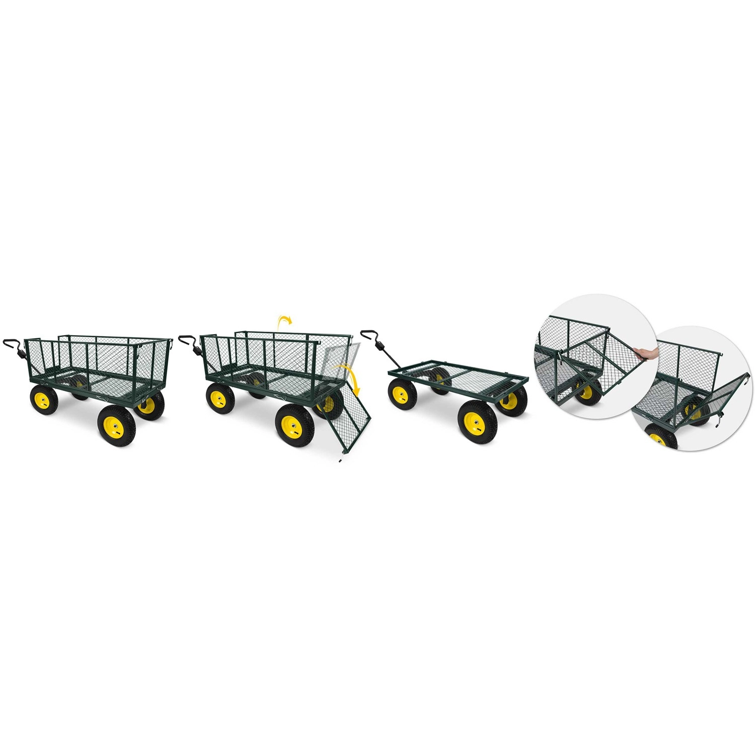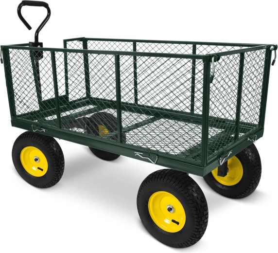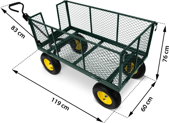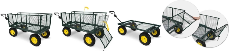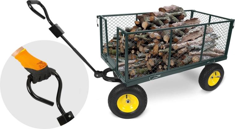 Pro hladký pohyb po trávě, štěrku i asfaltu jsou tu nafukovací kola s ventilkem a otočná přední náprava pro skvělou manévrovatelnost. Sklápěcí korba výrazně urychlí vysypávání nákladu a skládací konstrukce šetří místo při uložení. Ergonomická protiskluzová rukojeť zvyšuje komfort i bezpečnost při manipulaci.