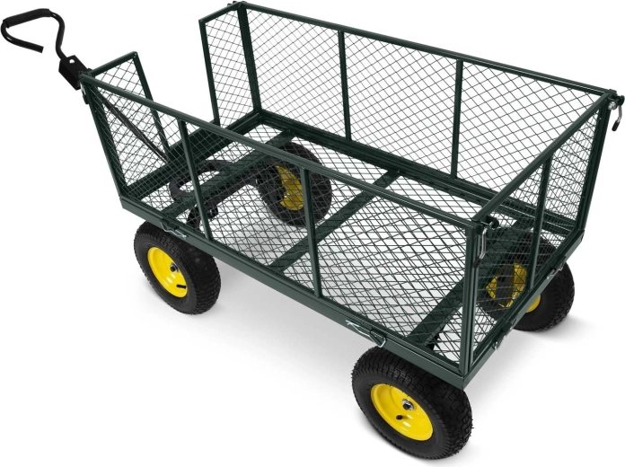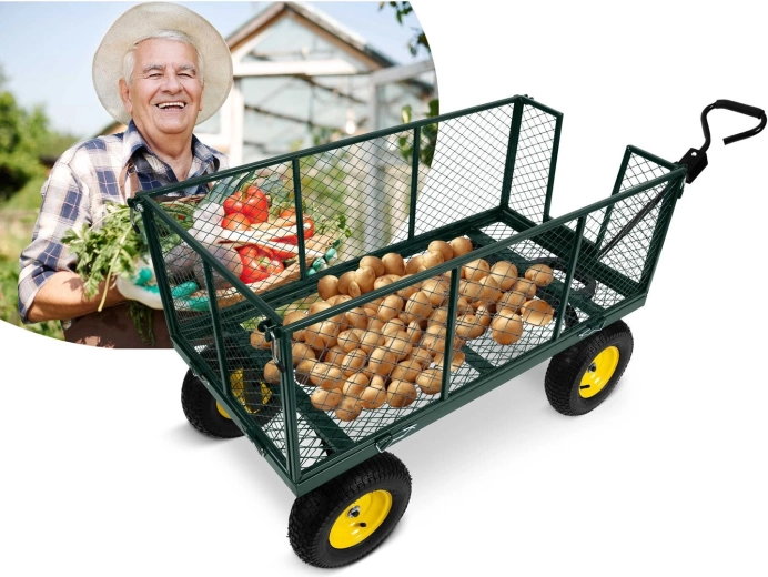 Univerzální zahradní vozík s objemem 280 l a robustním ocelovým rámem zvládne odvoz zeminy, listí i dřeva. Díky sklápěcí korbě, otočným předním kolům a pneumatickým pneumatikám se snadno ovládá i v nerovném terénu. Skládací konstrukce usnadňuje přenášení a skladování, protiskluzová rukojeť zajišťuje pohodlný a bezpečný úchop.