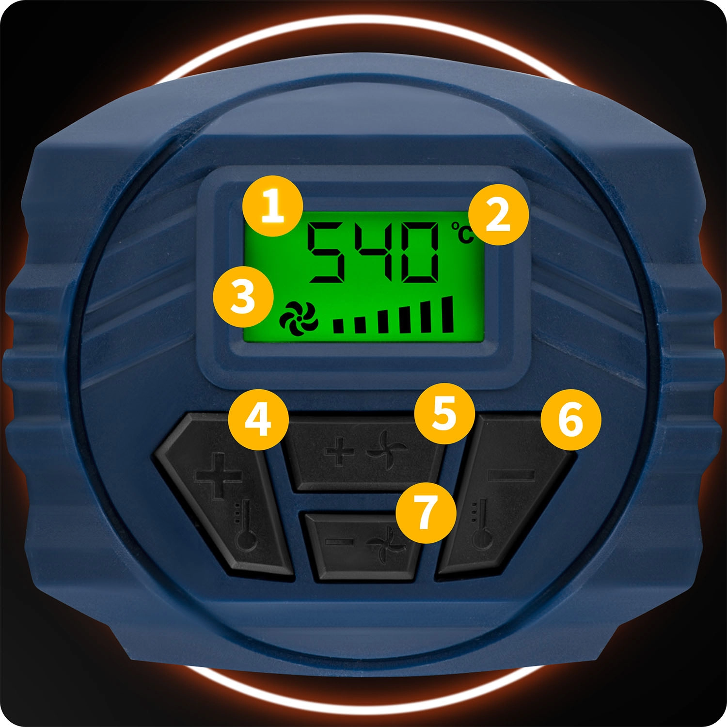 Robustní vícevrstvá konstrukce topného tělesa a tepelně izolované PP tělo brání přehřívání pláště. Ergonomická, pogumovaná rukojeť s ochranou prstů poskytuje jistý úchop. K dispozici jsou 2 pracovní režimy a až 6 úrovní průtoku vzduchu 300–500 l/min pro perfektní přizpůsobení úkolu. Snadné ovládání zajišťuje jediné multifunkční tlačítko.