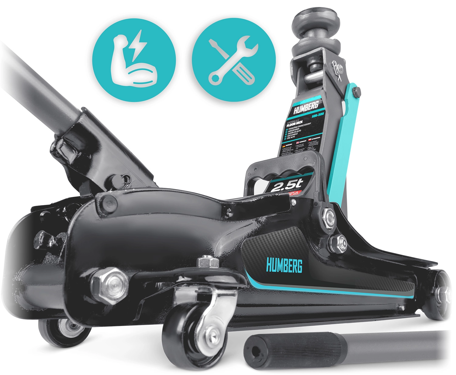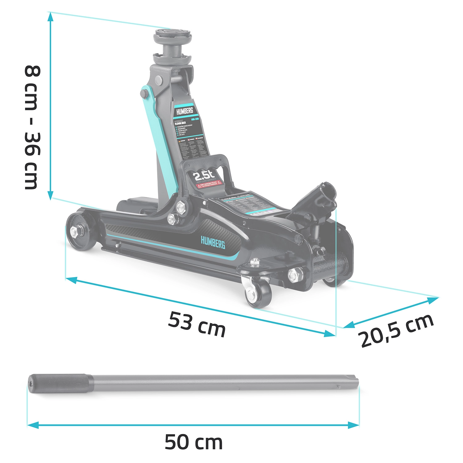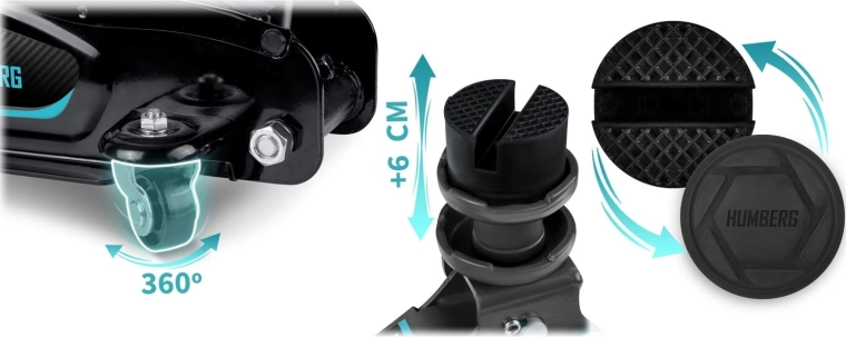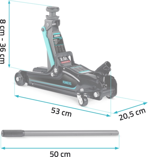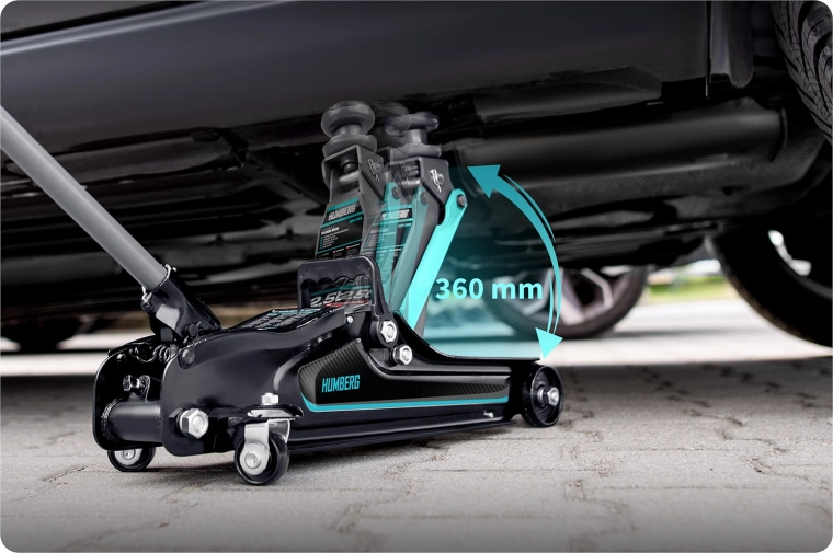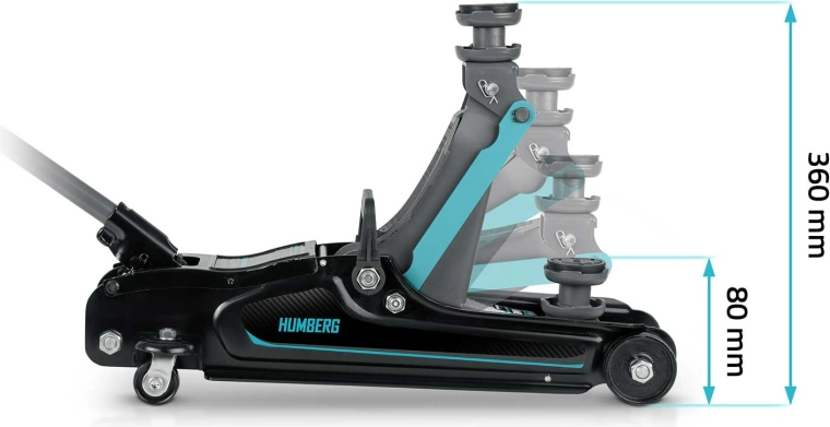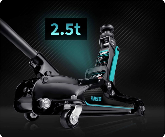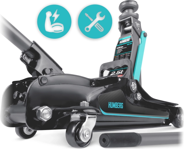 Výkonný nízkoprofilový hydraulický zvedák HUMBERG s nosností 2,5 t a rozsahem zdvihu 80–360 mm je ideální pro osobní vozy i malé dodávky. Nabízí robustní ocelovo-hliníkovou konstrukci, snadné manévrování díky kolům 360° a bezpečnostní přepouštěcí ventil. Součástí balení jsou 2 vyměnitelné gumové podložky a ocelová zvýšená hlavice pro lepší přizpůsobení různým prahům vozidel.