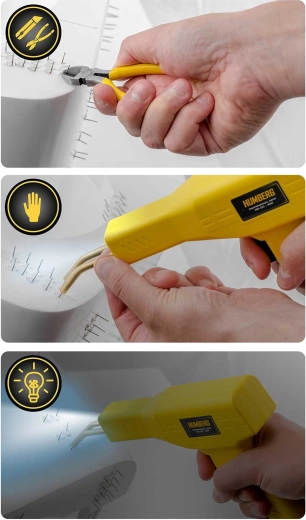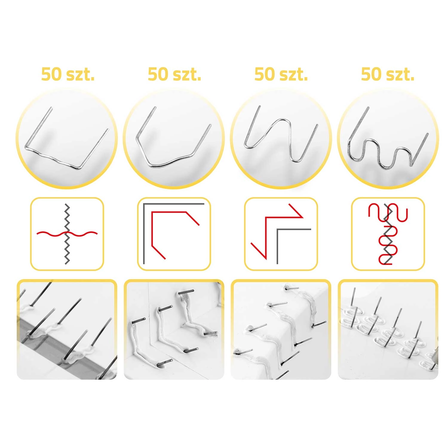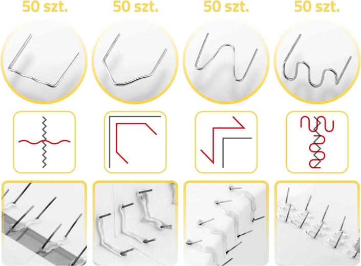 Součástí je bohatá sada 200 spon ve 4 tvarech pro různé typy prasklin – rovné, vnitřní i vnější rohy a širší poškození. Po zavaření snadno odstraníte přečnívající konce obcinákem a dorovnáte povrch odlamovacím nožem pro čistý výsledek připravený k případnému broušení či lakování.