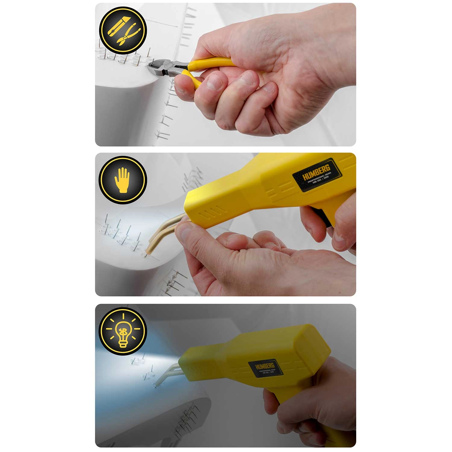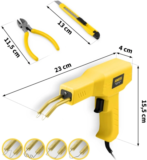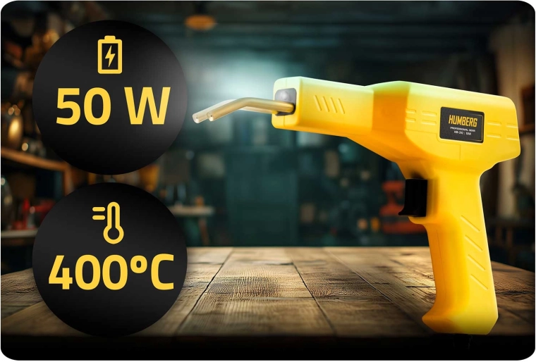 Praktická svářečka plastů HUMBERG o výkonu 50 W se zahřátím za 5 s až na 400 °C je ideální pro rychlé opravy nárazníků, krytů spotřebičů i interiérů vozidel. Kompletní sada v kufříku obsahuje 200 ks spon ve 4 typech, LED osvětlení, obcinák a nůž s odlamovací čepelí pro čisté dokončení. Odolné tělo z PP se nepřehřívá a zajišťuje snadné a bezpečné ovládání.