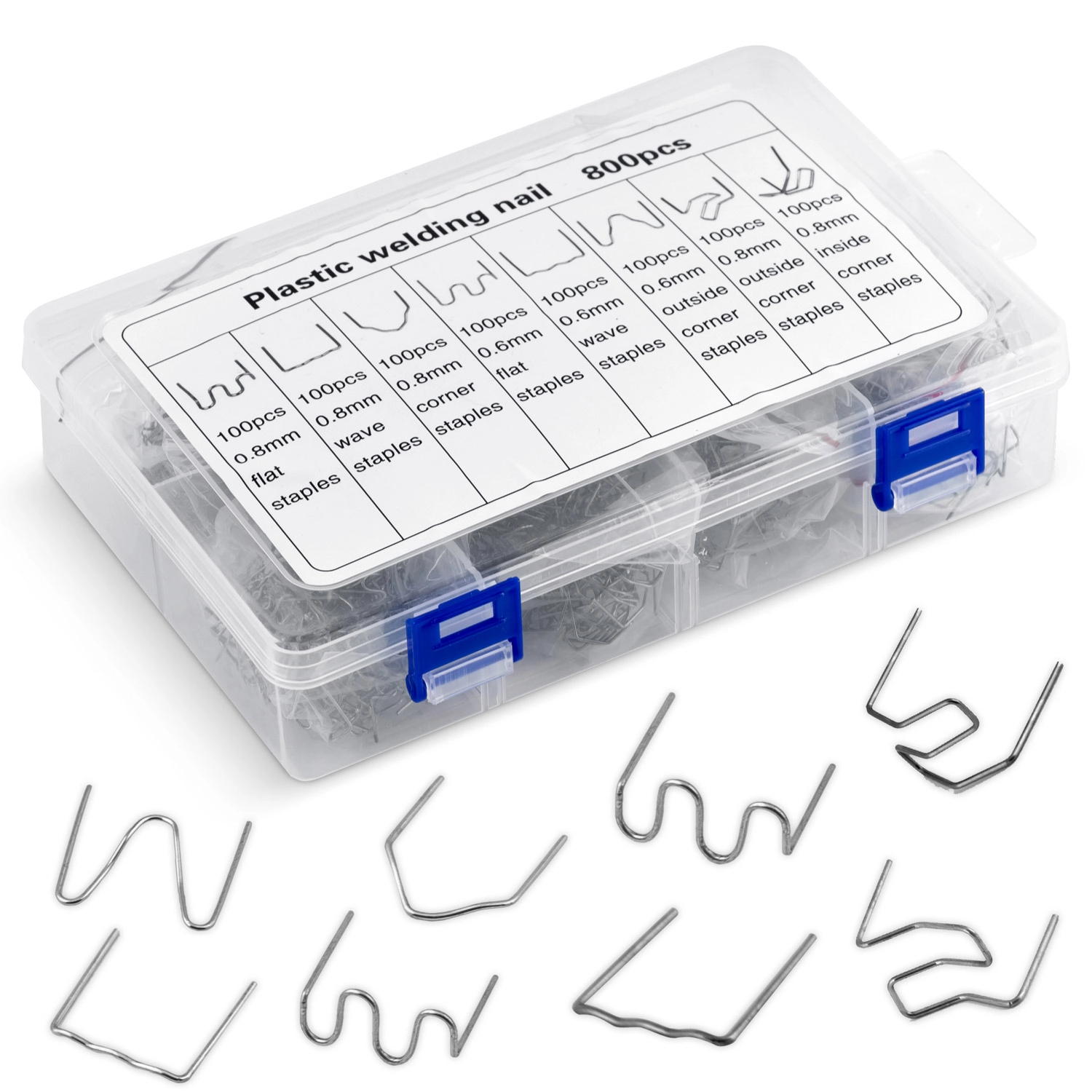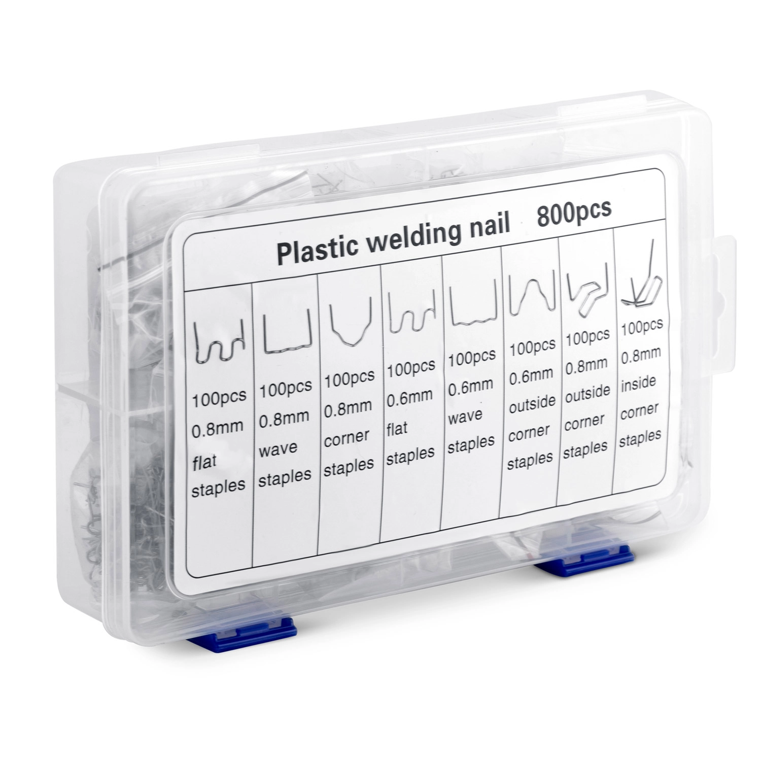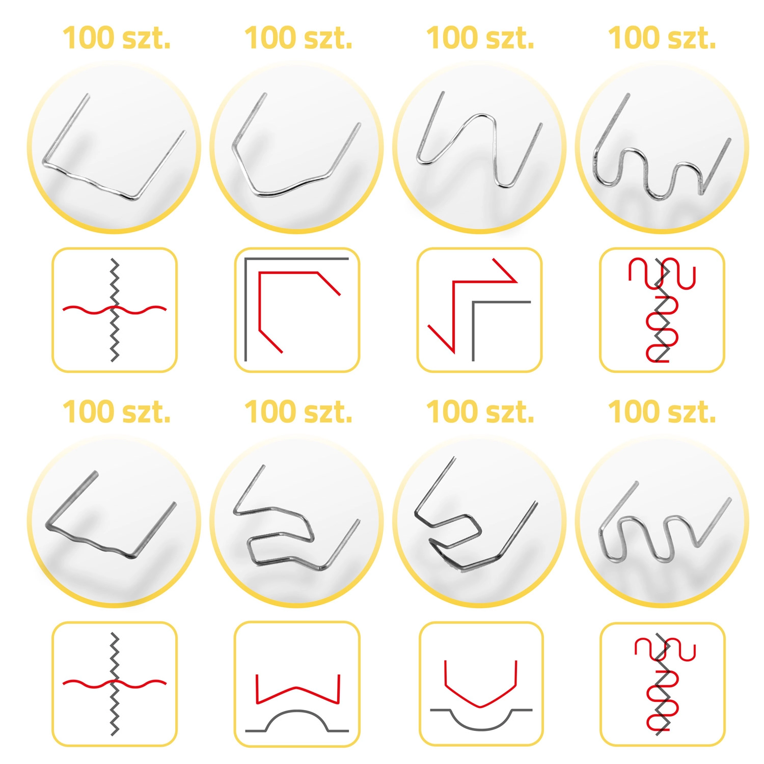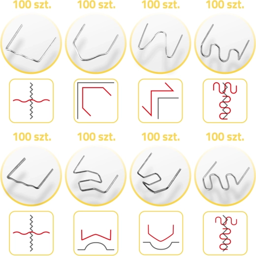 Obsah sady je navržen tak, aby pokryl nejčastější typy poškození plastů – od úzkých prasklin po široké zlomy, vnitřní i vnější rohy a zakřivené plochy. Vše je uloženo v přehledném kufříku, takže potřebný typ svorky vždy rychle najdete.