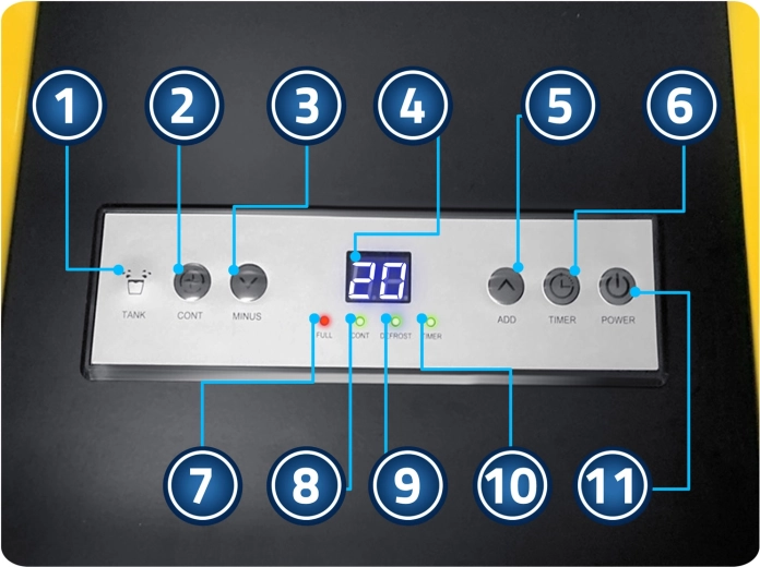 Zařízení je vybaveno přesným hygrostatem (20–90 % RH), režimem kontinuálního odvlhčování, 24hodinovým časovačem a automatickým odmrazováním pro spolehlivý chod při nižších teplotách. Odtok vody řešíte buď do vyjímatelné nádrže 5,5 l, nebo nepřetržitě pomocí 4m hadice (součástí balení). Filtr předčištění je omyvatelný a chrání vnitřek před prachem.