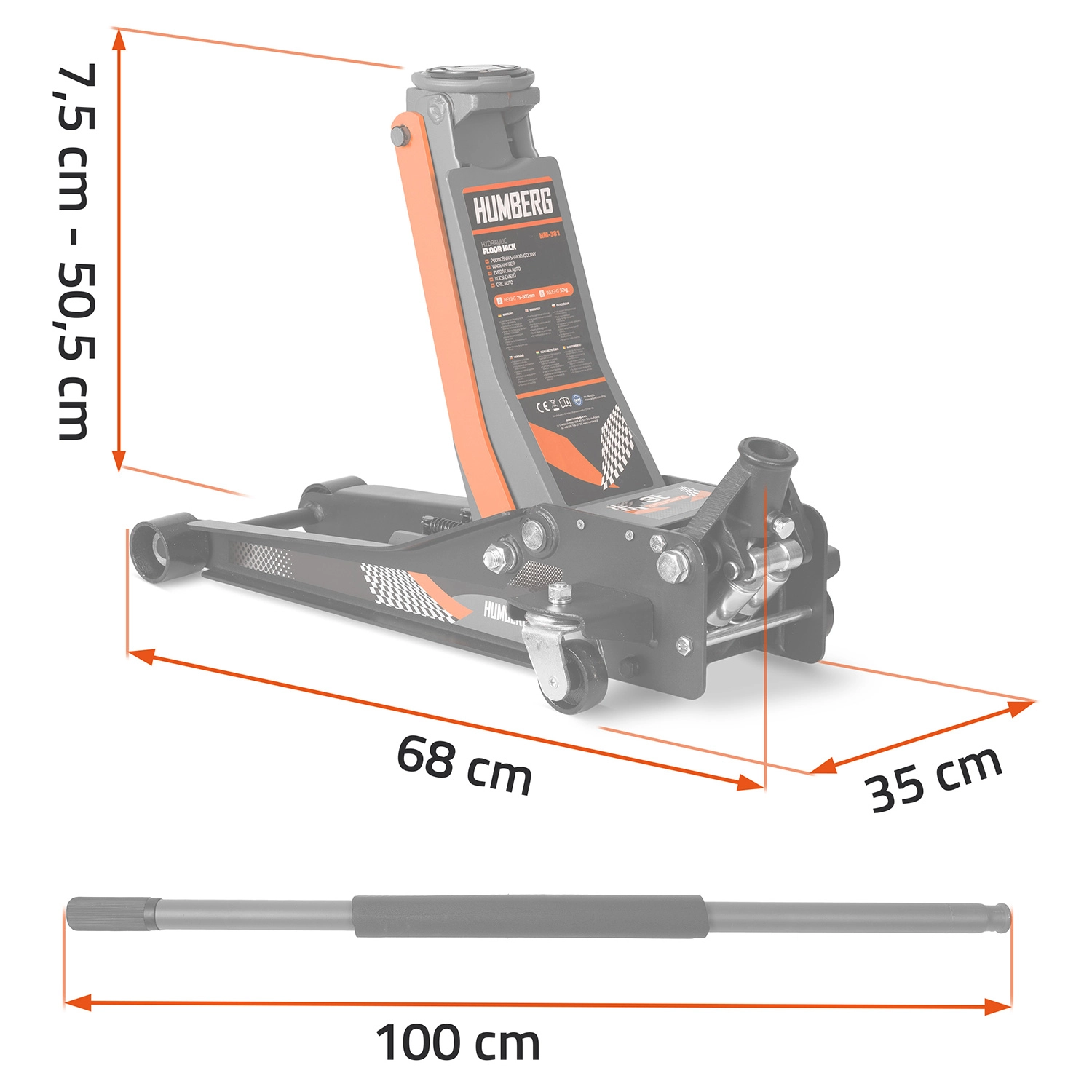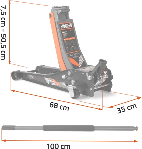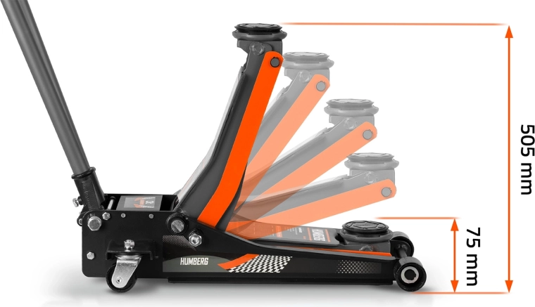 Hledáte stabilní a odolný dílenský zvedák pro pravidelný servis pneumatik i opravy? HUMBERG HM-381 nabízí robustní ocelovo-hliníkovou konstrukci, nosnost až 3000 kg a extra dlouhou 100cm páku pro pohodlné ovládání s menší námahou. Nízký profil od 75 mm dovolí snadný zásah i u sportovně snížených vozů, zatímco maximální výška 505 mm poskytne dostatek prostoru pro údržbu.