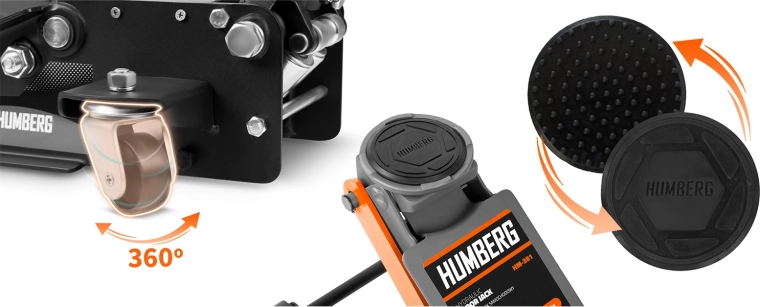 Pro bezpečnou práci je zvedák vybaven přetlakovým bezpečnostním ventilem, širokými předními koly a otočnými zadními kolečky s ložisky pro hladký pohyb. Dvě výměnné gumové podložky chrání prahy a body zdvihu vozidla. Díky promyšlené ergonomii, pevné rukojeti a protiskluzové úchopové ploše je manipulace snadná i v náročných podmínkách.