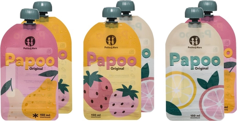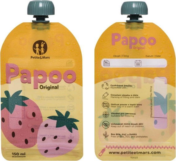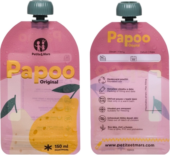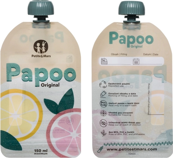 Praktické a ekologické kapsičky PETITE&MARS Papoo Original o objemu 150 ml jsou ideální na přesnídávky, pyré a jogurty na cesty. Lze je opakovaně používat, mýt v myčce, zmrazit a snadno popsat. Bez škodlivin BPA, PVC a ftalátů a navržené tak, aby se děti samy pohodlně nakrmily bez nepořádku.