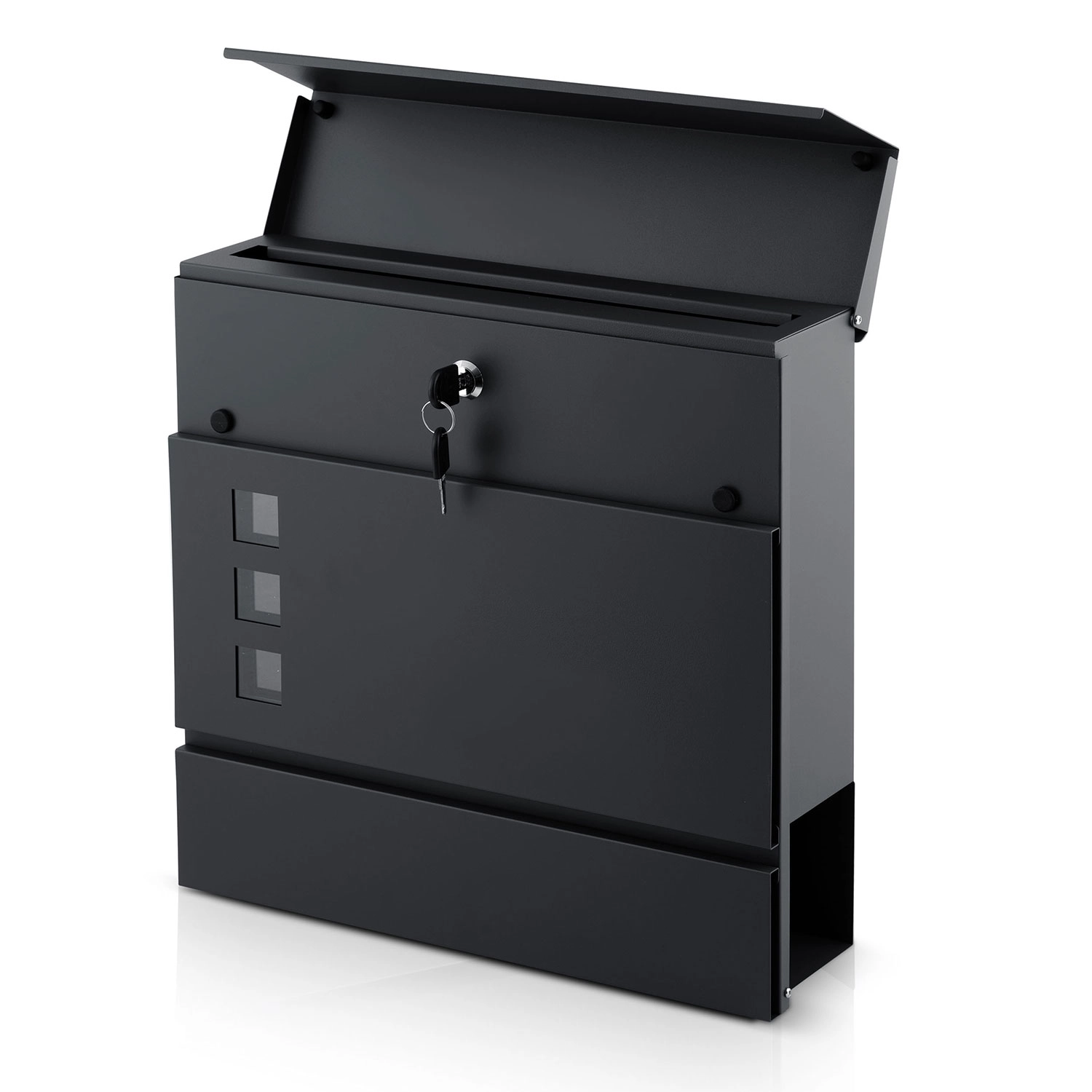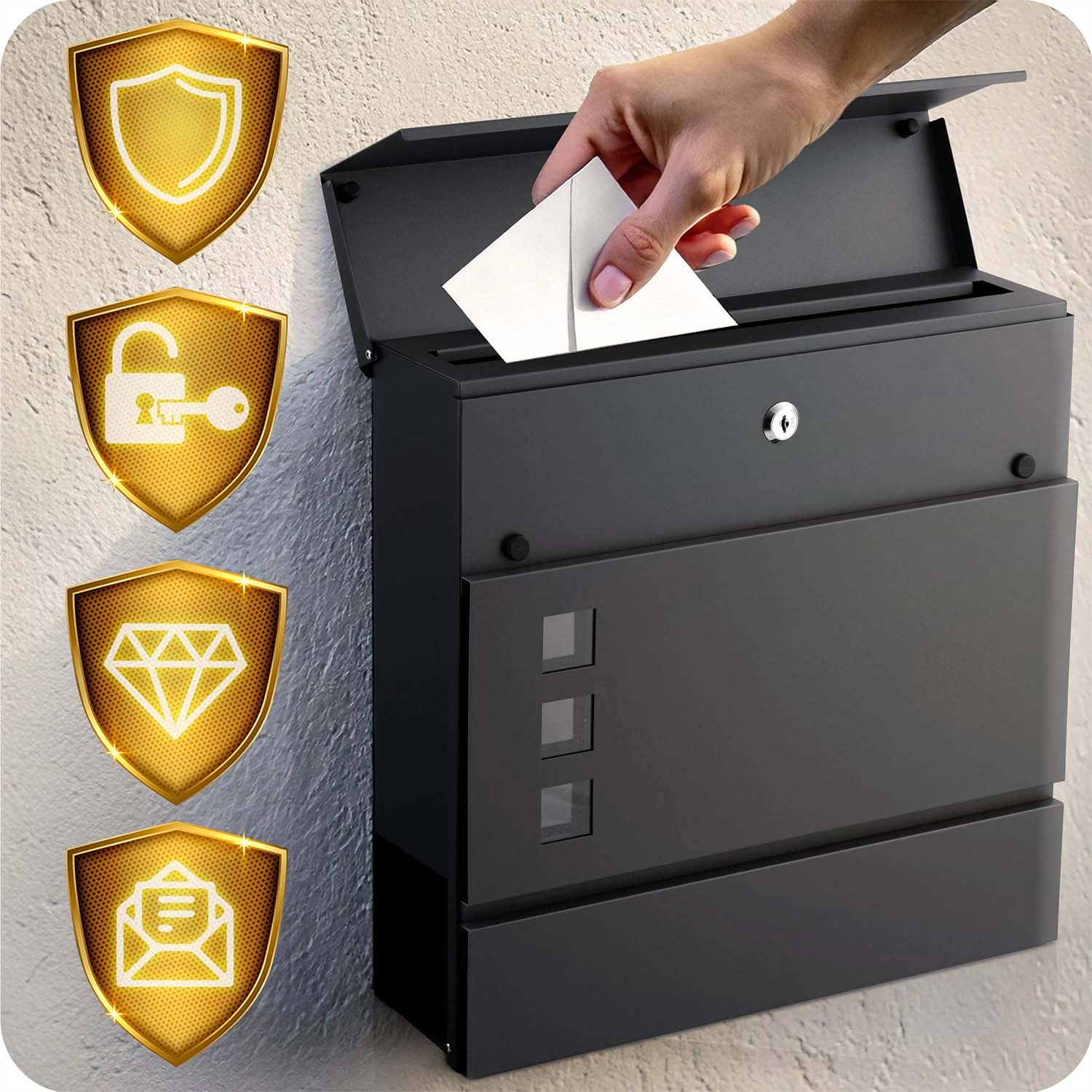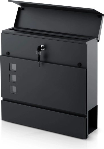 Moderní poštovní schránka z galvanizované oceli s gazetníkem v elegantní antracitové barvě zaručuje bezpečné uložení pošty i novin. Díky práškovému lakování odolá povětrnosti, má tichý, amortizovaný horní vhoz, okénko pro kontrolu obsahu a bezpečný zámek se dvěma klíči. Snadná montáž díky přiložené sada hmoždinek a šroubů.