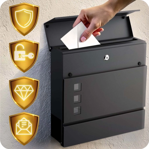Stylová a funkční schránka v antracitové barvě skvěle ladí s moderními fasádami i ploty. Odolná galvanizovaná ocel s práškovým lakem chrání proti korozi, dešti i UV záření, takže si dlouhodobě zachová vzhled i funkčnost. Praktický horní vhoz s tlumeným dovíráním brání třískání a chrání poštu před vlhkostí a zvědavými pohledy.